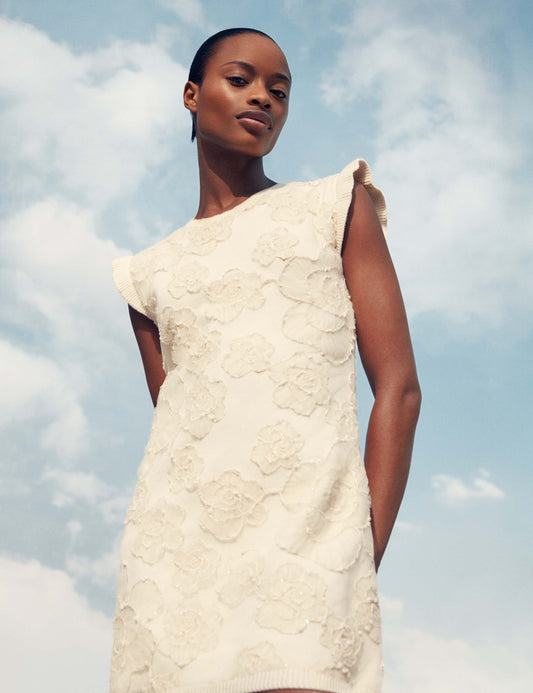 Rib-Knit Woven Mix Cut-Out Midi Dress in Ivory