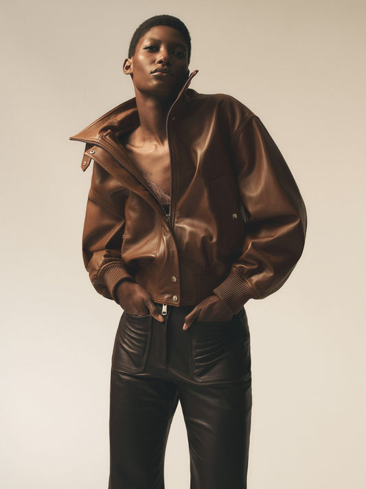 Leather Funnel-Neck Bomber Jacket in Chestnut Brown