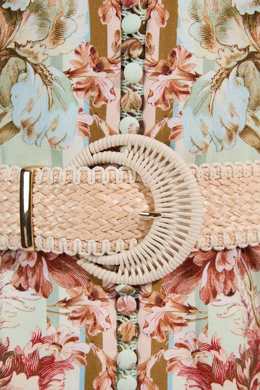 Mirrored Viscose Linen Floral Print With Raffia Belt Woven Midi Skirt