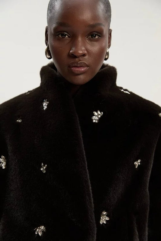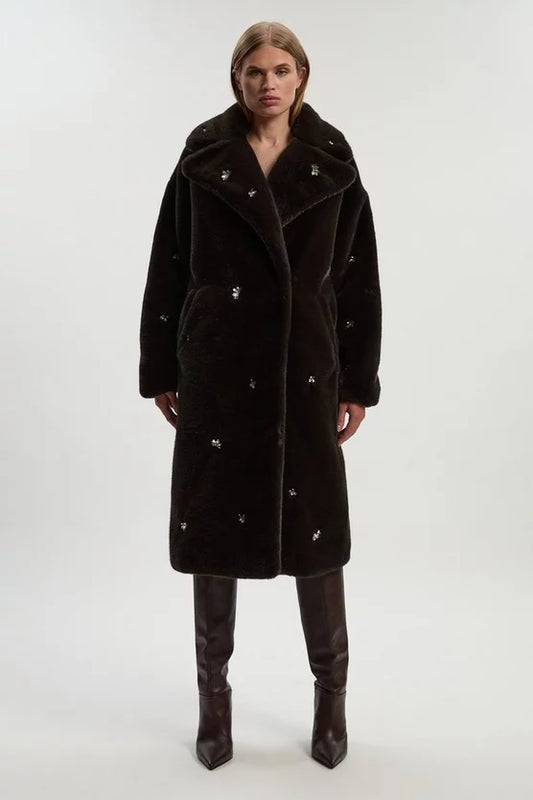 Crystal Embellished Faux Fur Long Coat