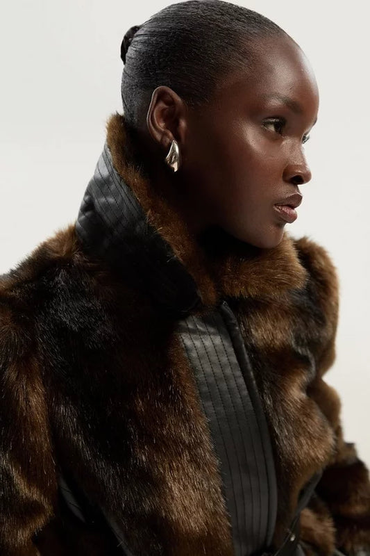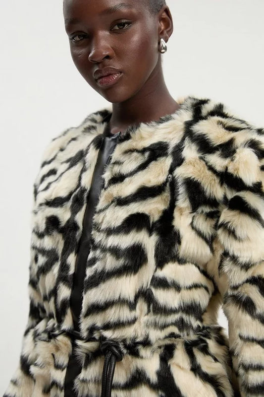 Faux Fur Zebra Collarless Tie Belted Midi Coat