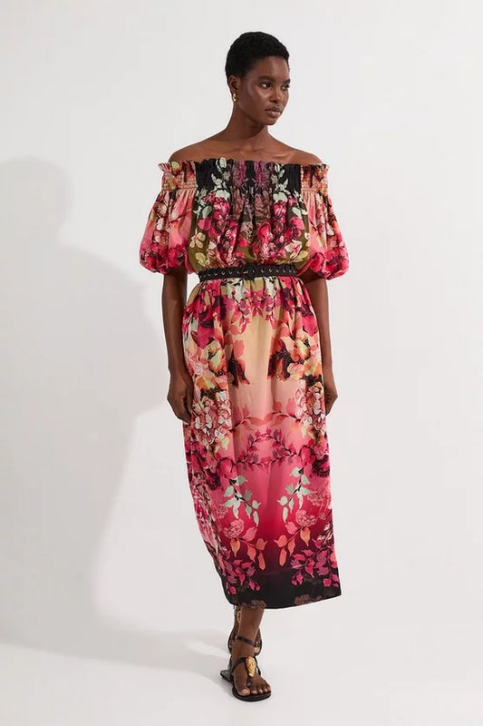 Voile Mirrored Floral Woven Bardot Midi Dress