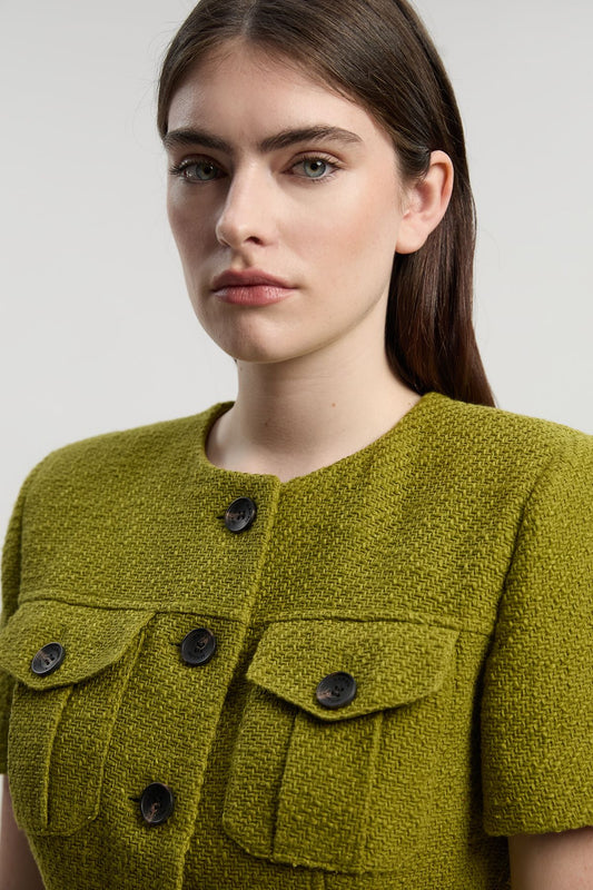 Textured Tweed Tailored Pocket Front Short Sleeve Midi Dress