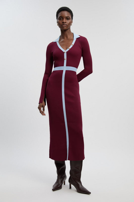 Knit Rib With Contrast Waist Detail Collared Midi Dress