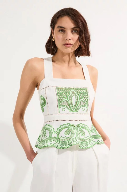 Cutwork Embroidered Ruffle Woven Strappy Top