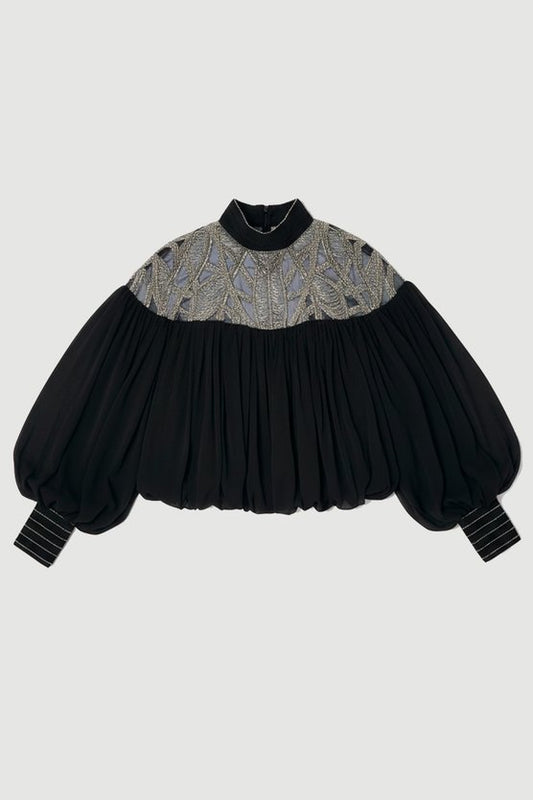 Crystal Embellished Cutwork Cape Detail Woven Drama Blouse