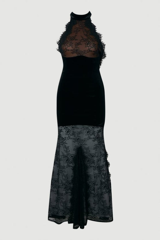 Lace With Velvet Detail Halter Neck Maxi Dress