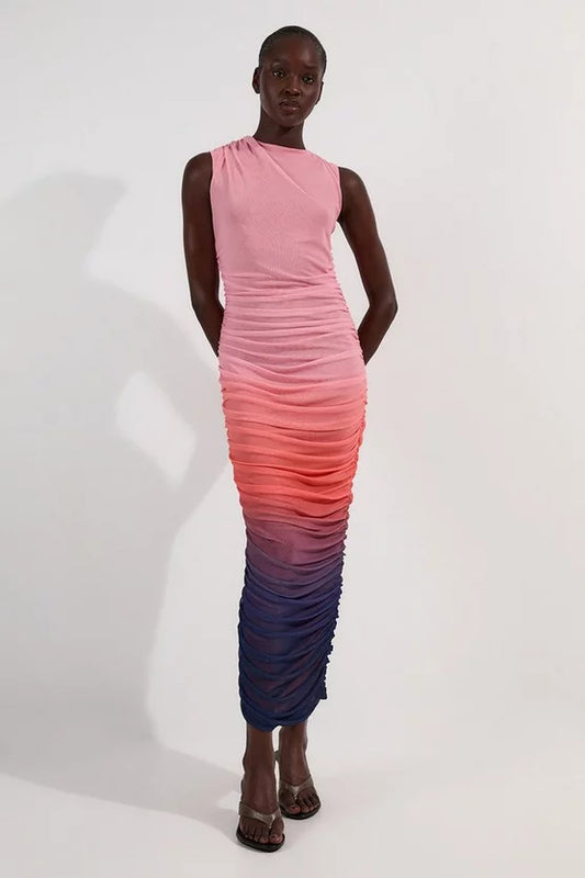 Sunset Ombre Mesh Ruched Jersey Maxi Dress