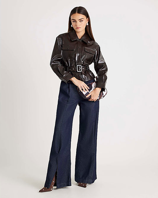 Red High Shine Belted Faux leather Shirt