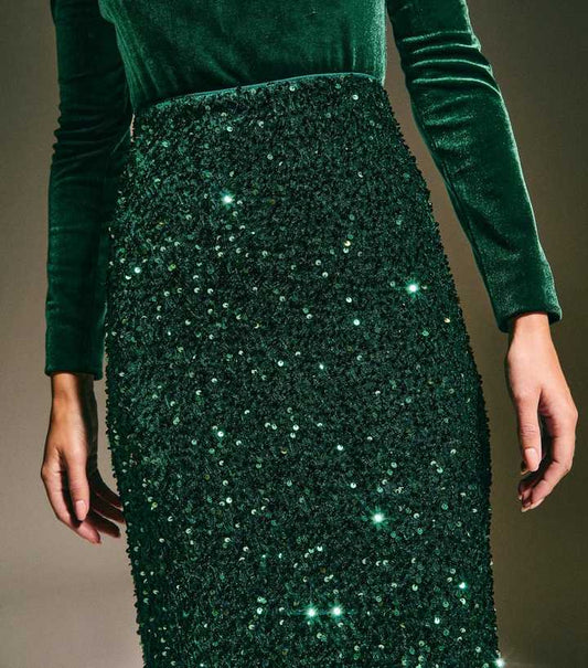 Dark Green Velvet Sequin Embellished Midi Skirt