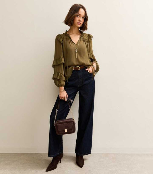 Khaki Chiffon Frilly Trimmed Keyhole Neck Blouse
