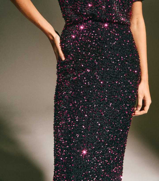 Burgundy Velvet Sequin Embellished Midi Skirt