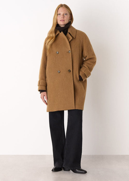 Camel Short Button Detail Wool Coat