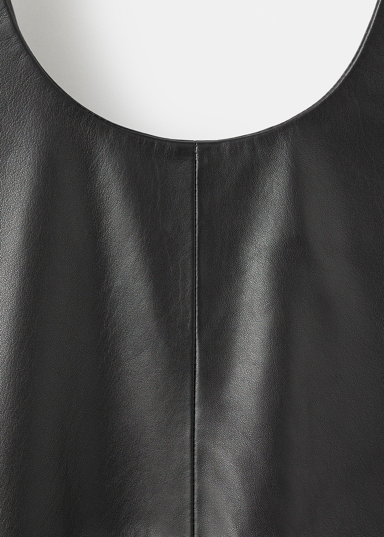 100% ovine leather. Midi design. Straight Design. Low neckline. Sleeveless. Wide straps. Back neckline. Side zip closure. Inner lining. Selection Collection.