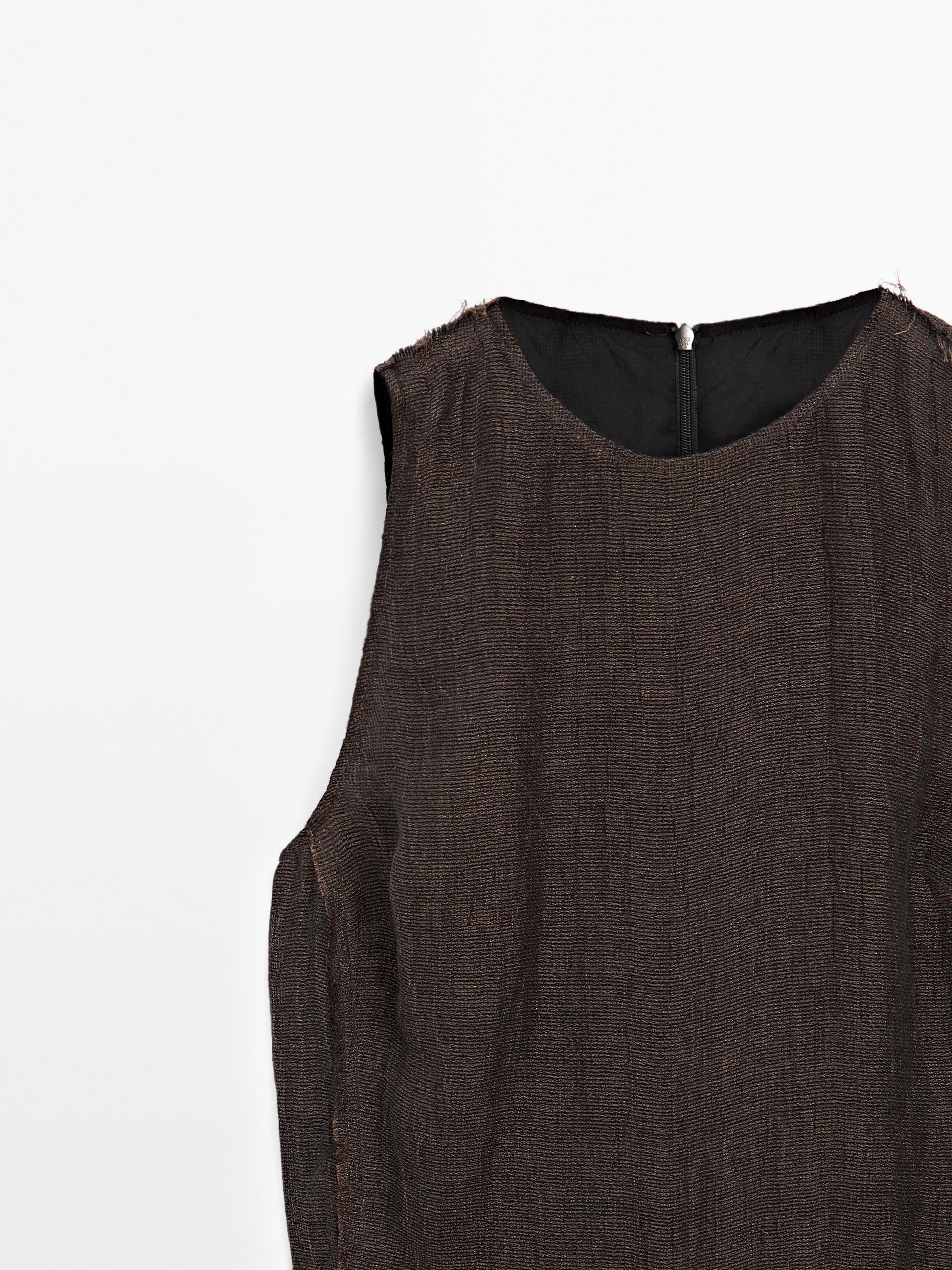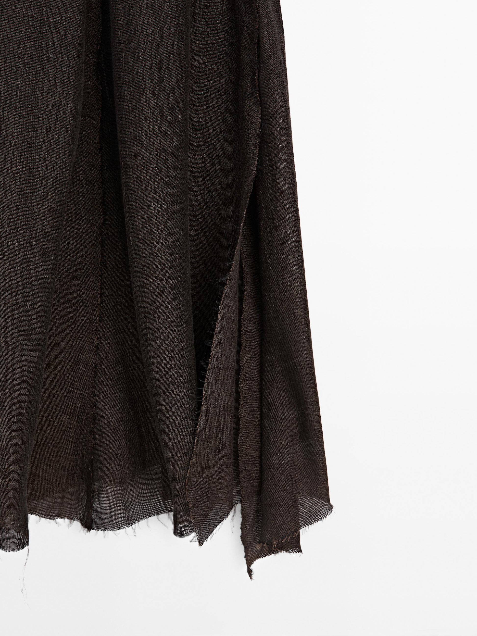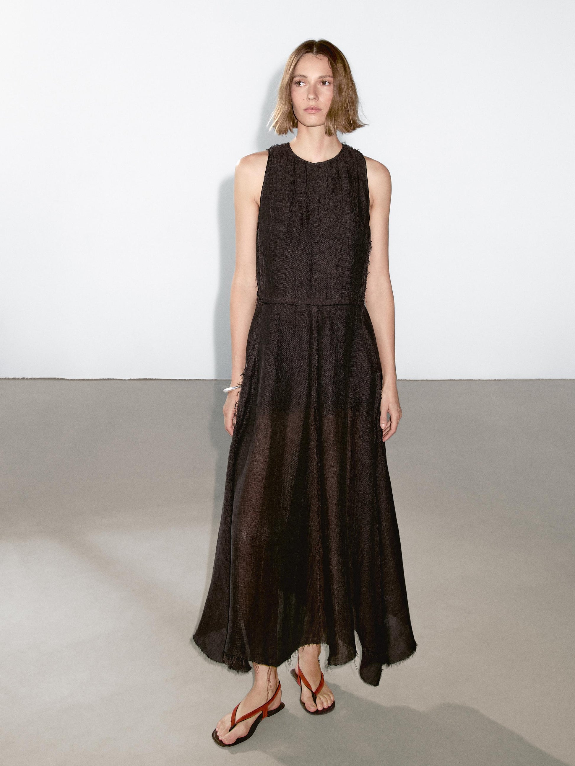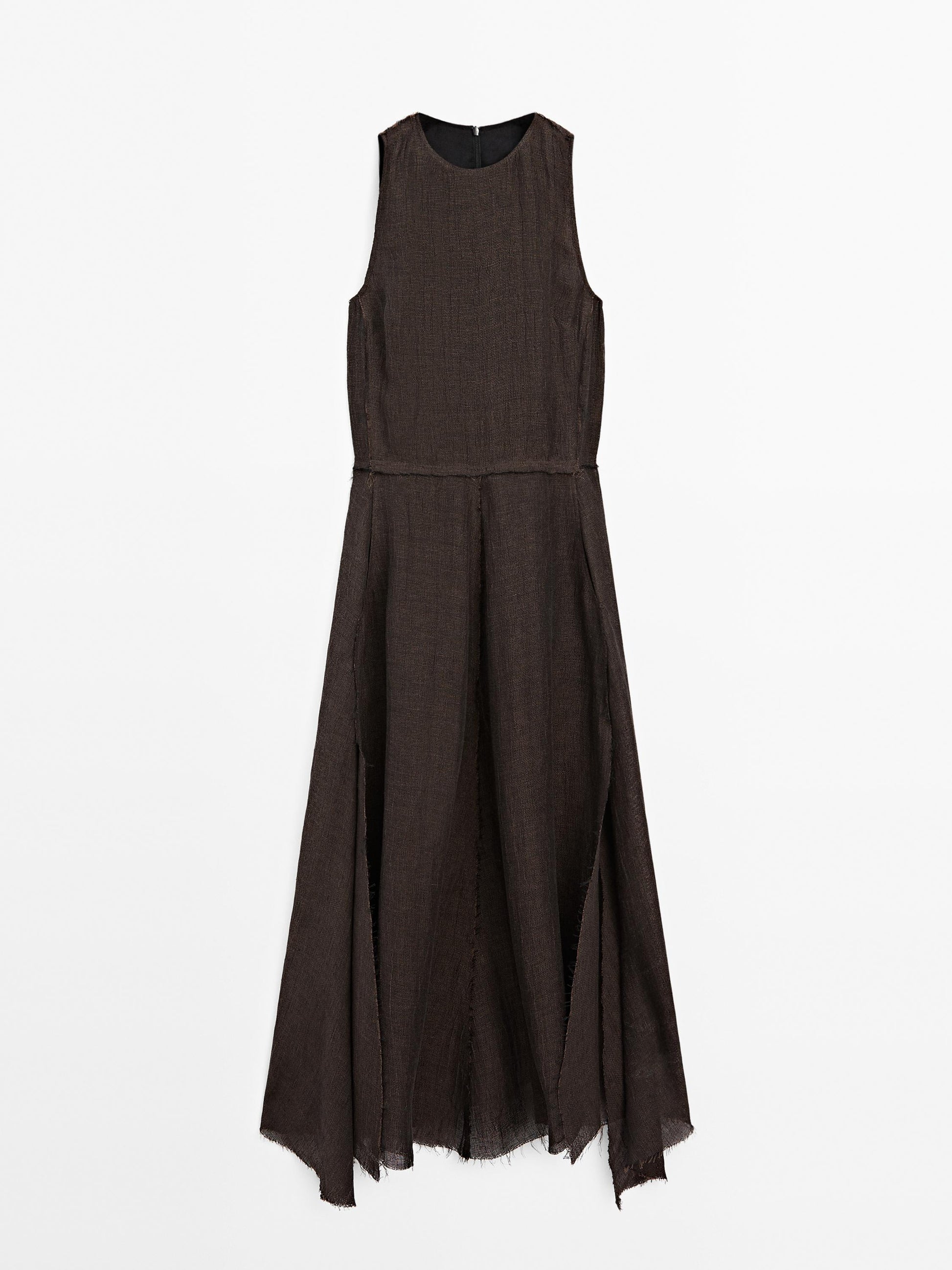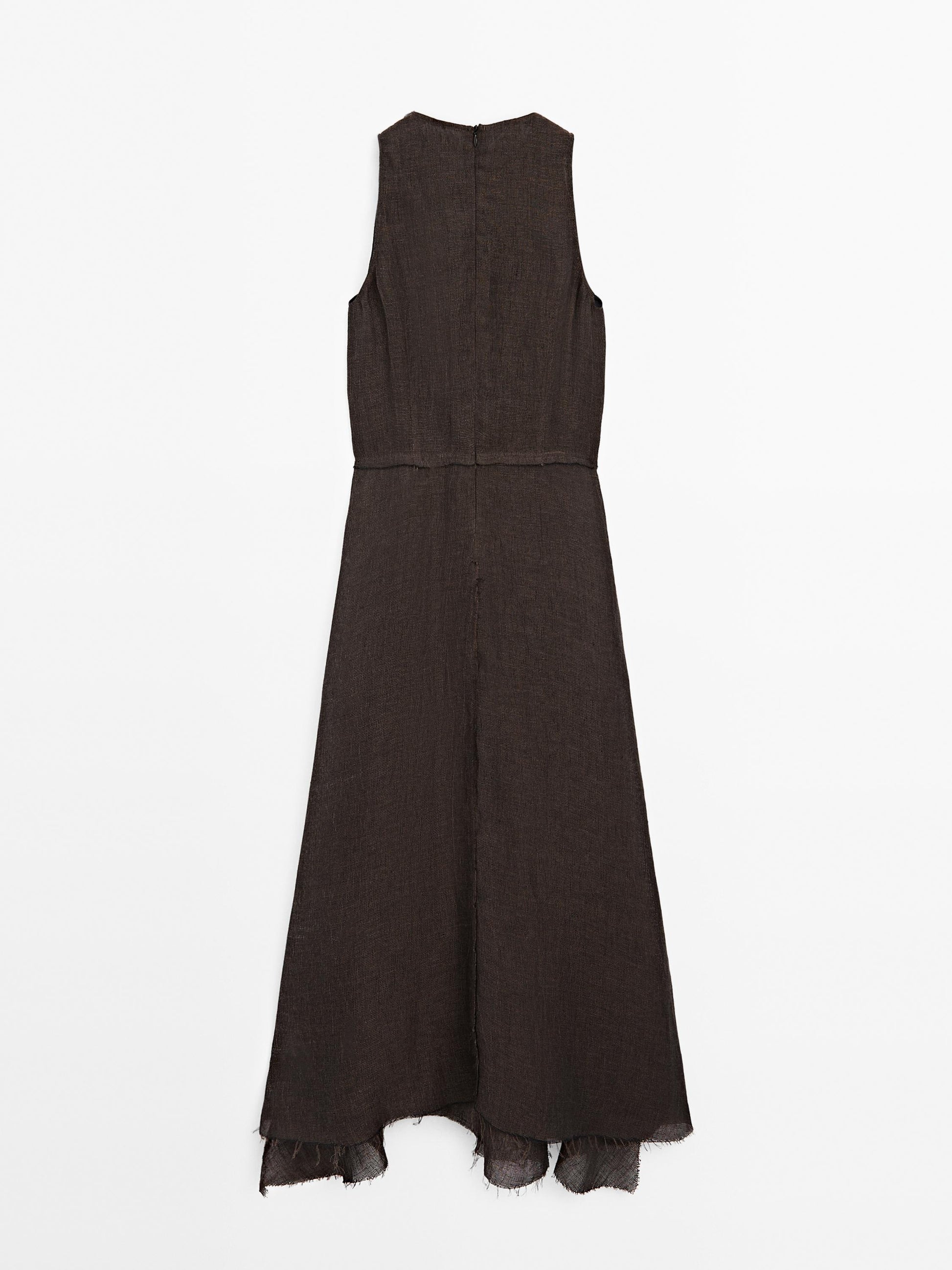Midi dress made of 100% linen fabric . Crew neck. Zip fastening at the back. Two side pockets. Side vents at the hem. Frayed hem. Flowing fabric.