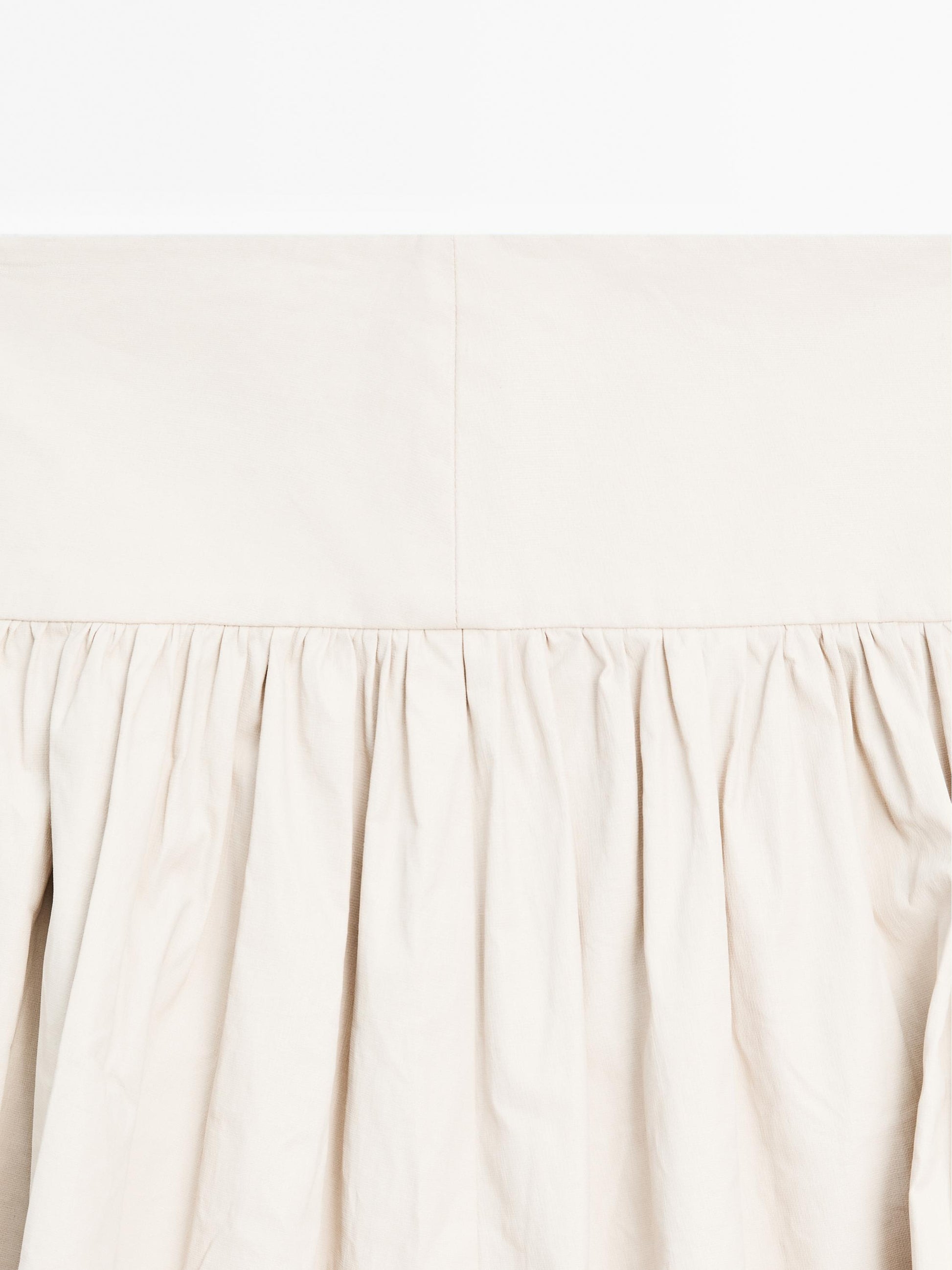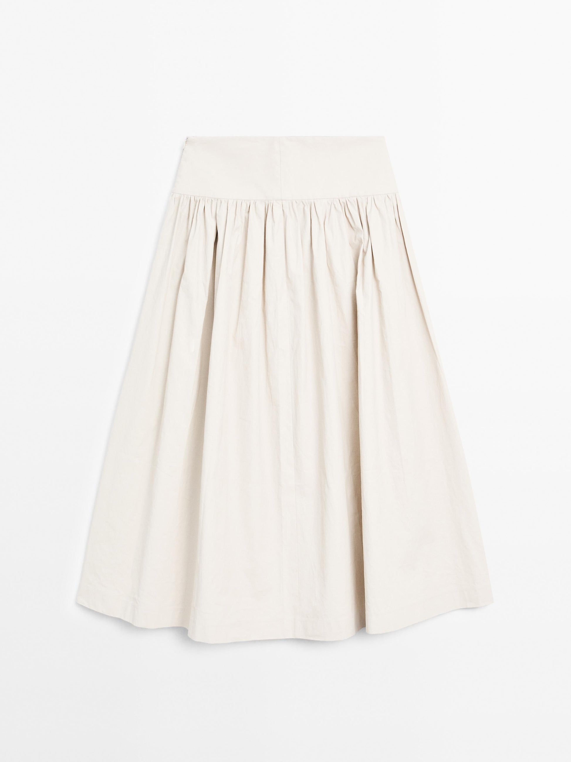 Midi skirt made from 100% linen fabric. Fitted corset belt detail at the waist. Zip fastening at the back. Gathered detail. Matching garment available.