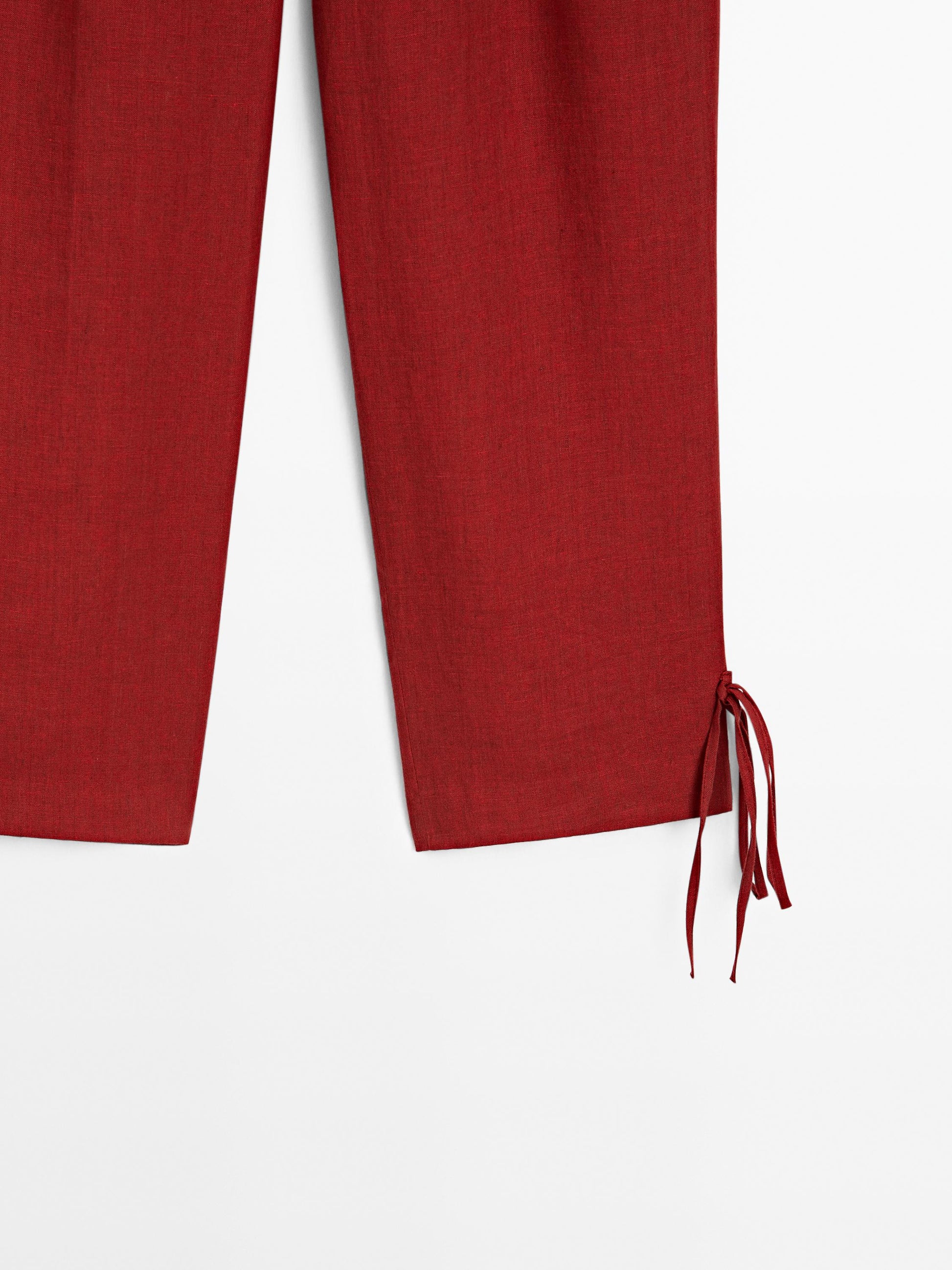 Trousers made of 100% linen.. Zip fastening concealed by a placket, with hook-and-eye clasp and button. Elasticated back of the waist. Two side pockets. Drawstring detail on hem. The garment is part of a 3-piece look.