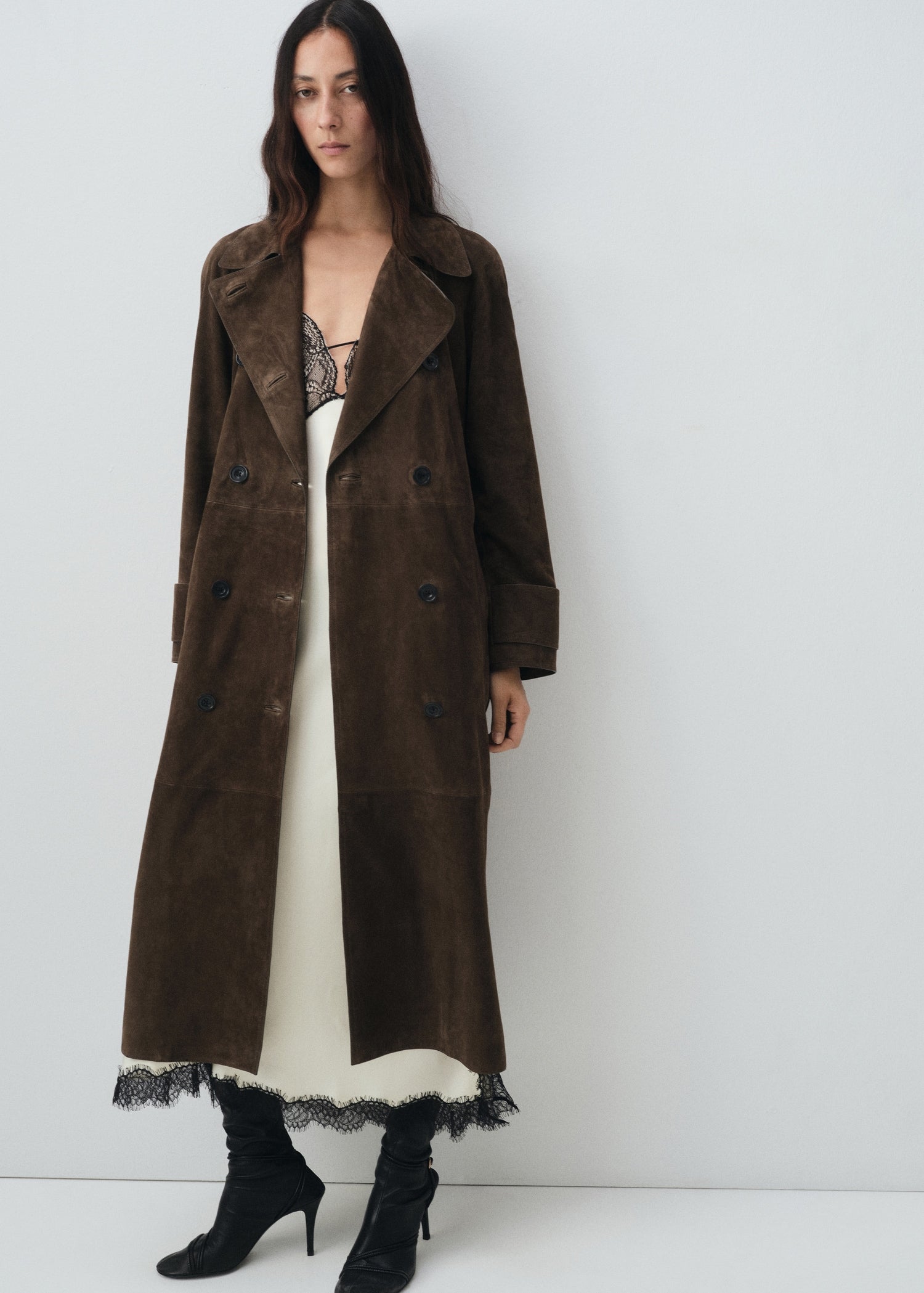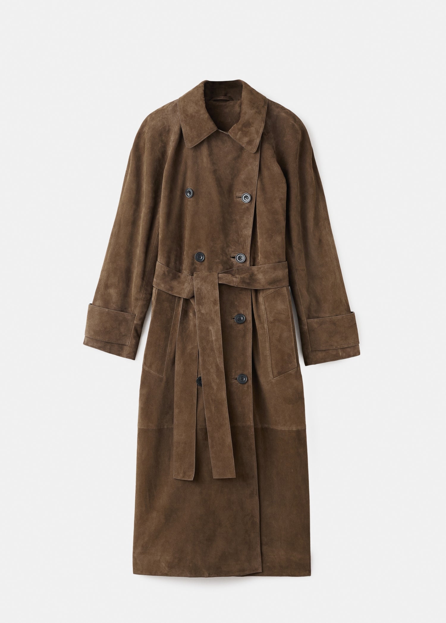 Crafted from 100% goat suede, this long, straight design features a shirt collar and long sleeves with buttoned cuffs. It includes a robe-style belt, two side pockets, and a double-breasted fastening. Interior lining. Selection Collection.
