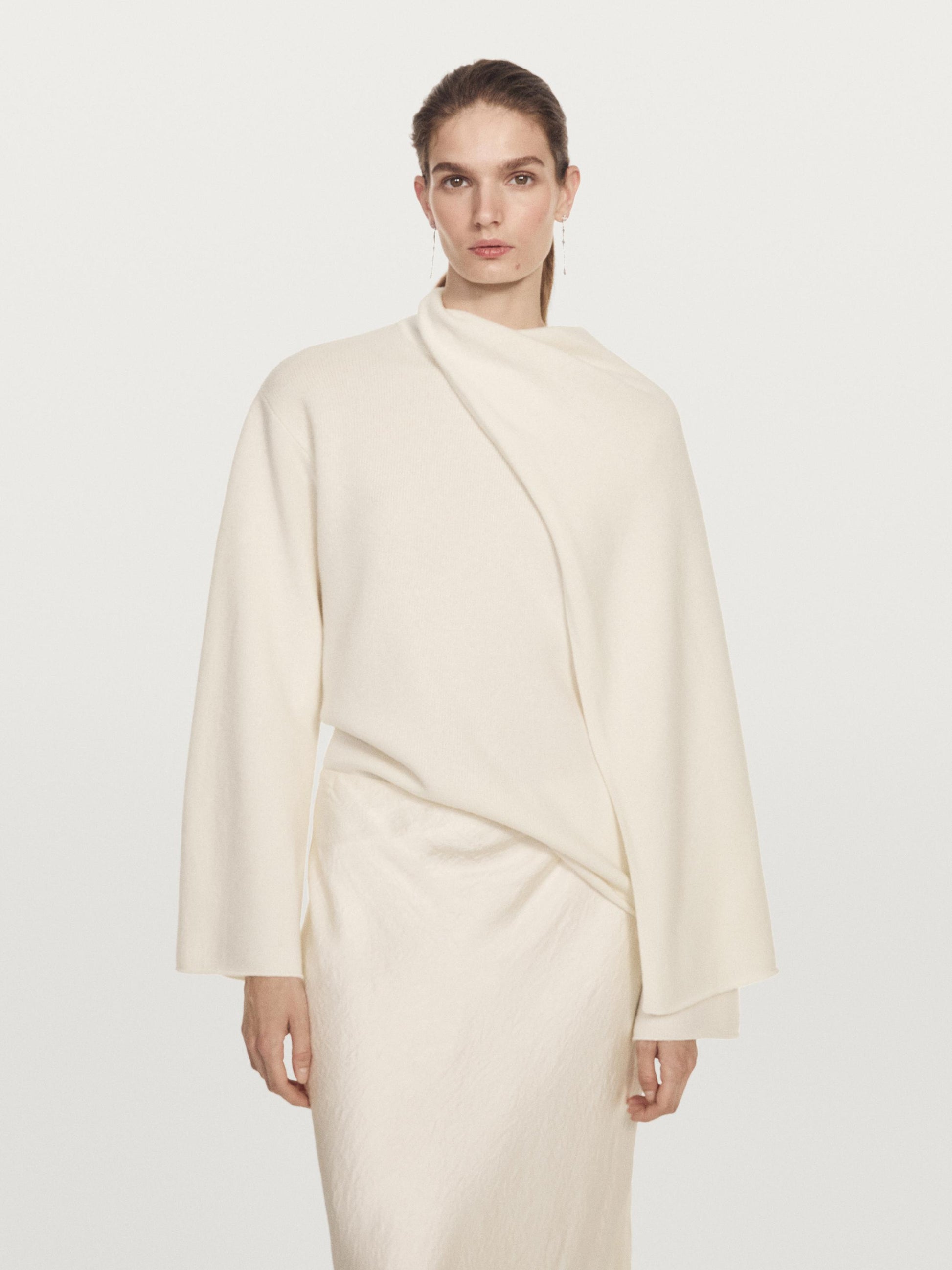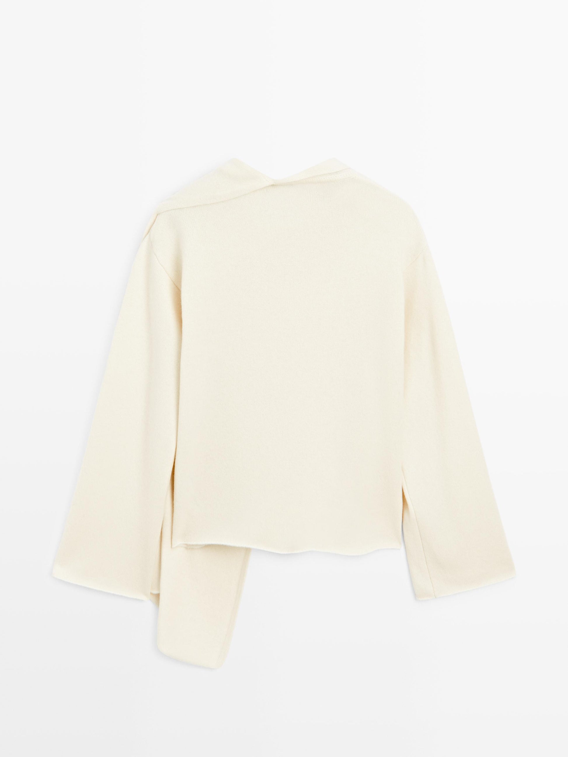 Sweater made of 100% wool . Wraparound collar. Long sleeves. Scarf detail at the neck .