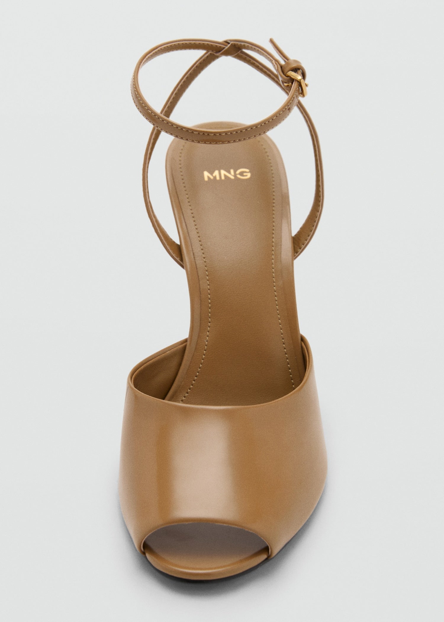 Faux leather. Open toe. Funnel heel. 10 cm heel. Buckle closure at the ankle. Online Exclusive.