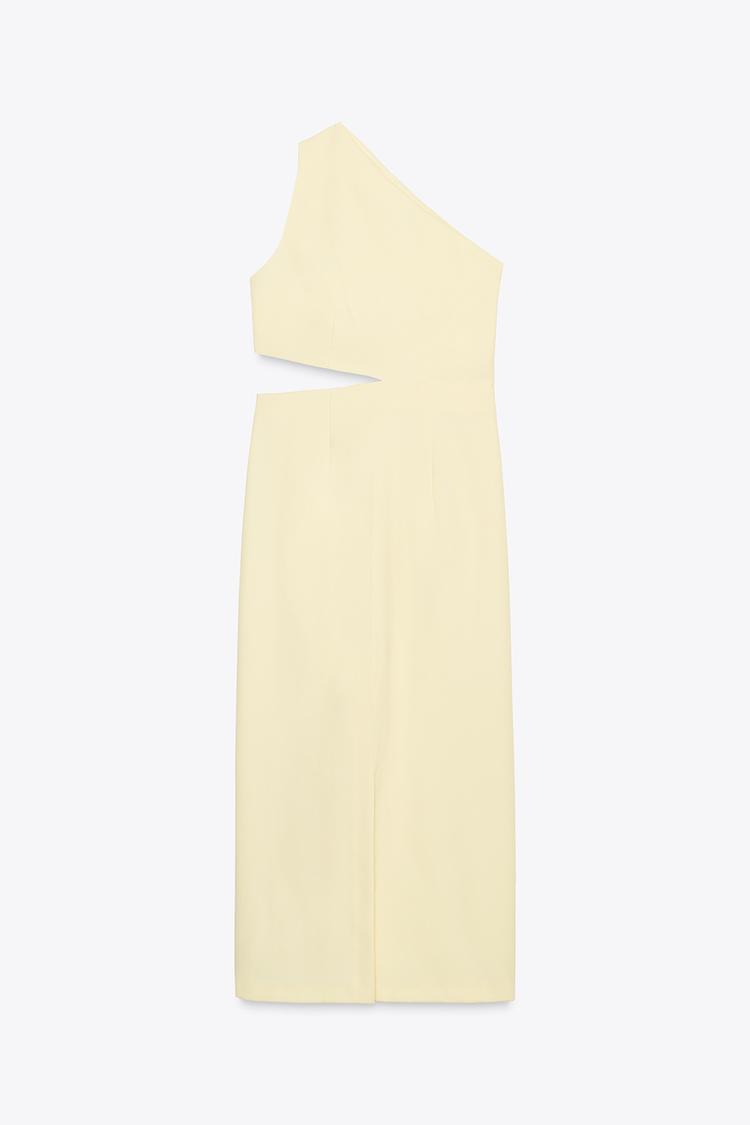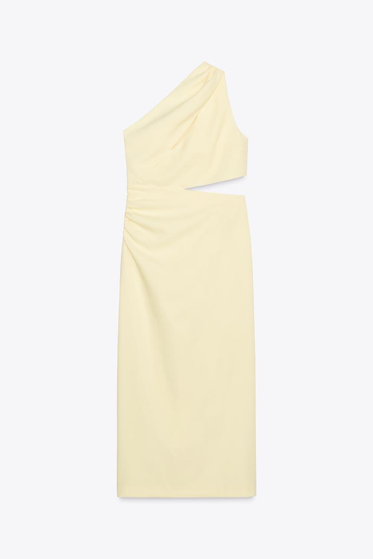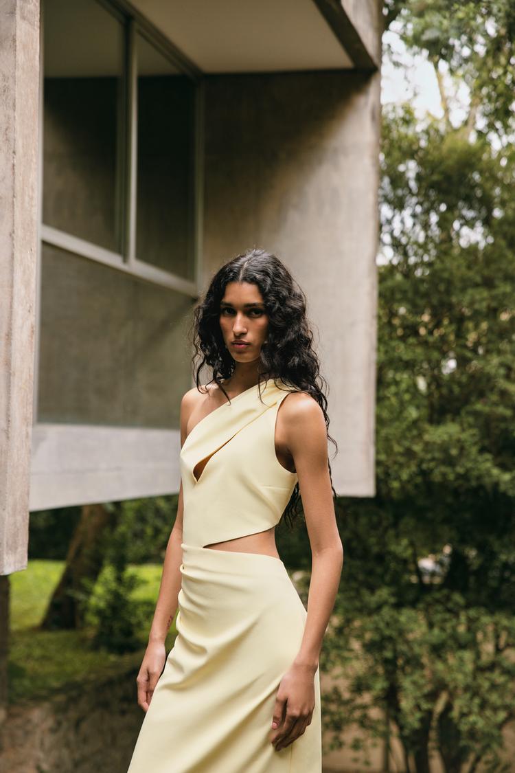 Fitted dress with an asymmetric neckline and sleeveless design. Featuring cut-out detail and gathered trims. Hem with a vent at the back. Side zip fastening concealed in the seam.