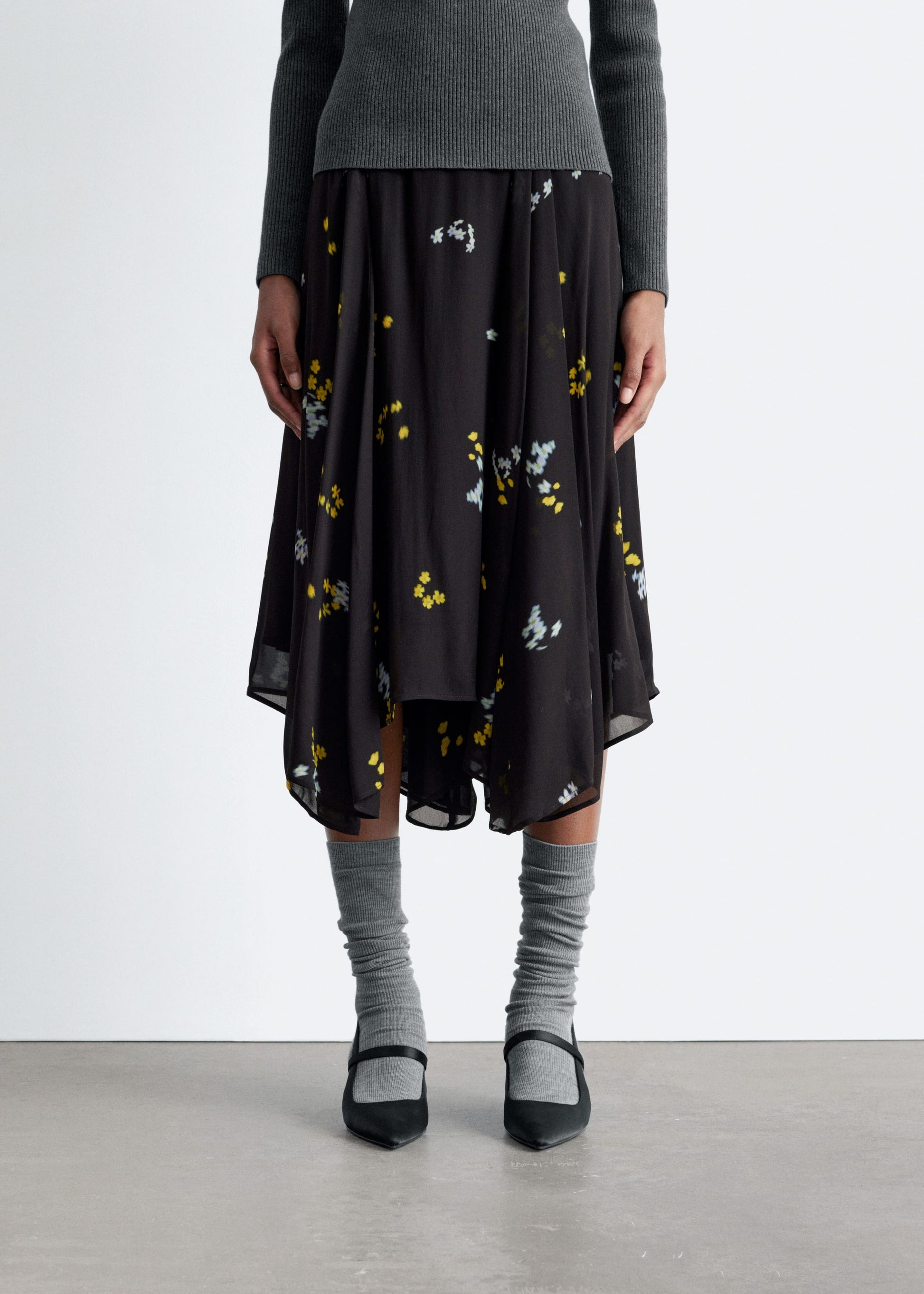 Crafted from chiffon, this midi skirt is cut in a flowy silhouette with subtle panels creating movement and an asymmetric hemline. Finished with a concealed side zipper.