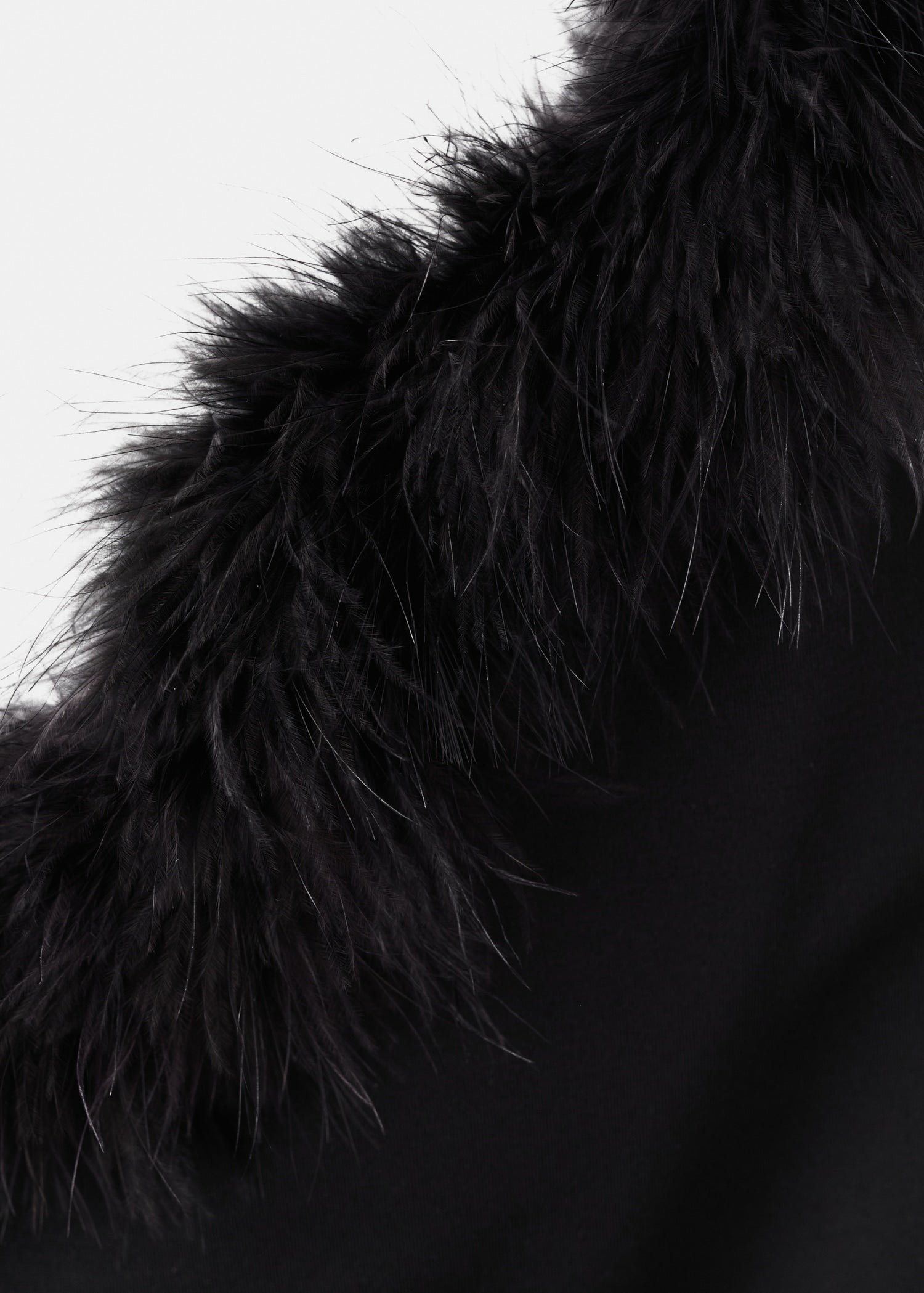 This top features a fitted design with an asymmetrical feather-adorned neckline. It comes with matching trousers