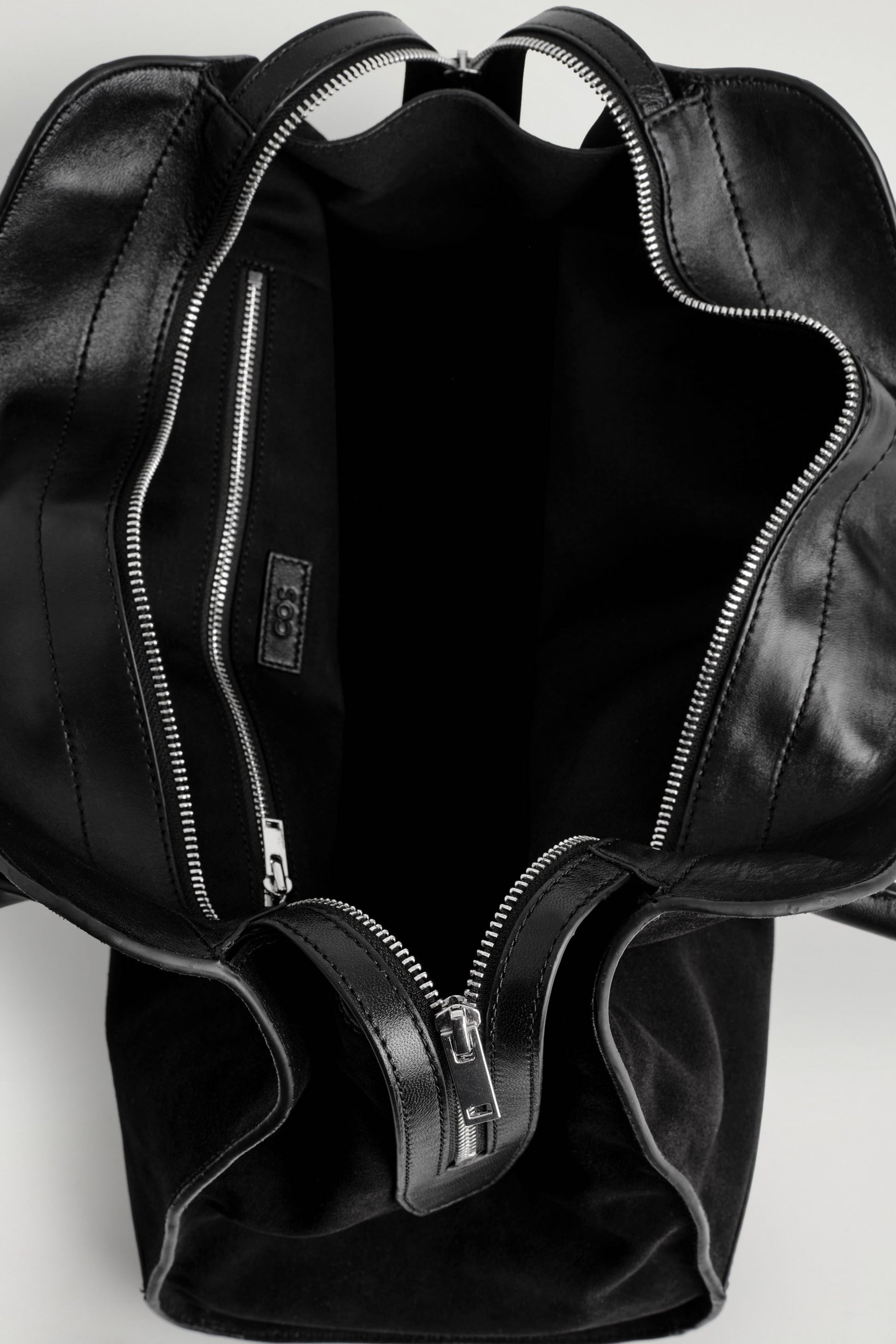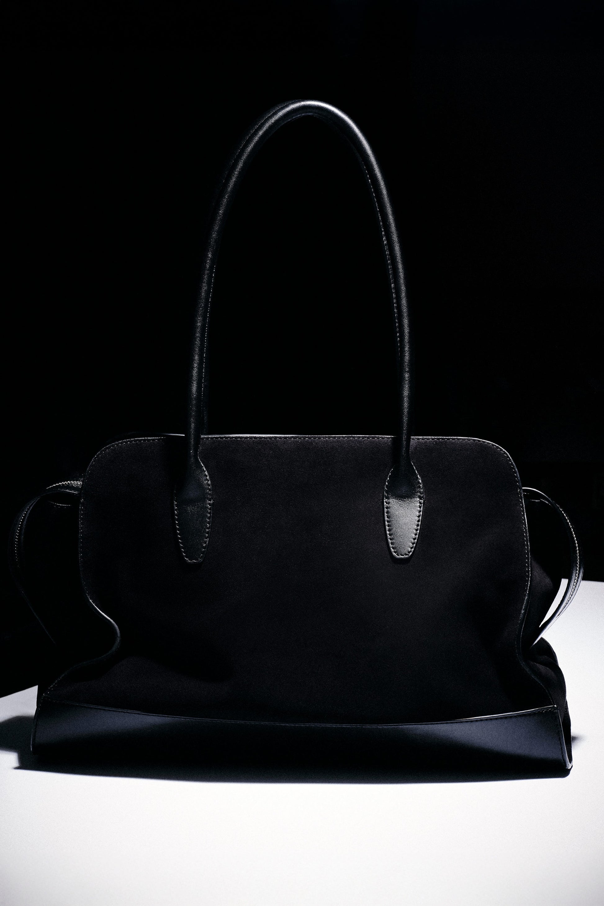 Modern shapes and luxuriously tactile fabrics come together in the COS accessories collection. The Avenue tote is crafted from supple black suede and accented with butter-soft leather. It has a generous shape with rounded handles, an internal pocket and a two-way zip.