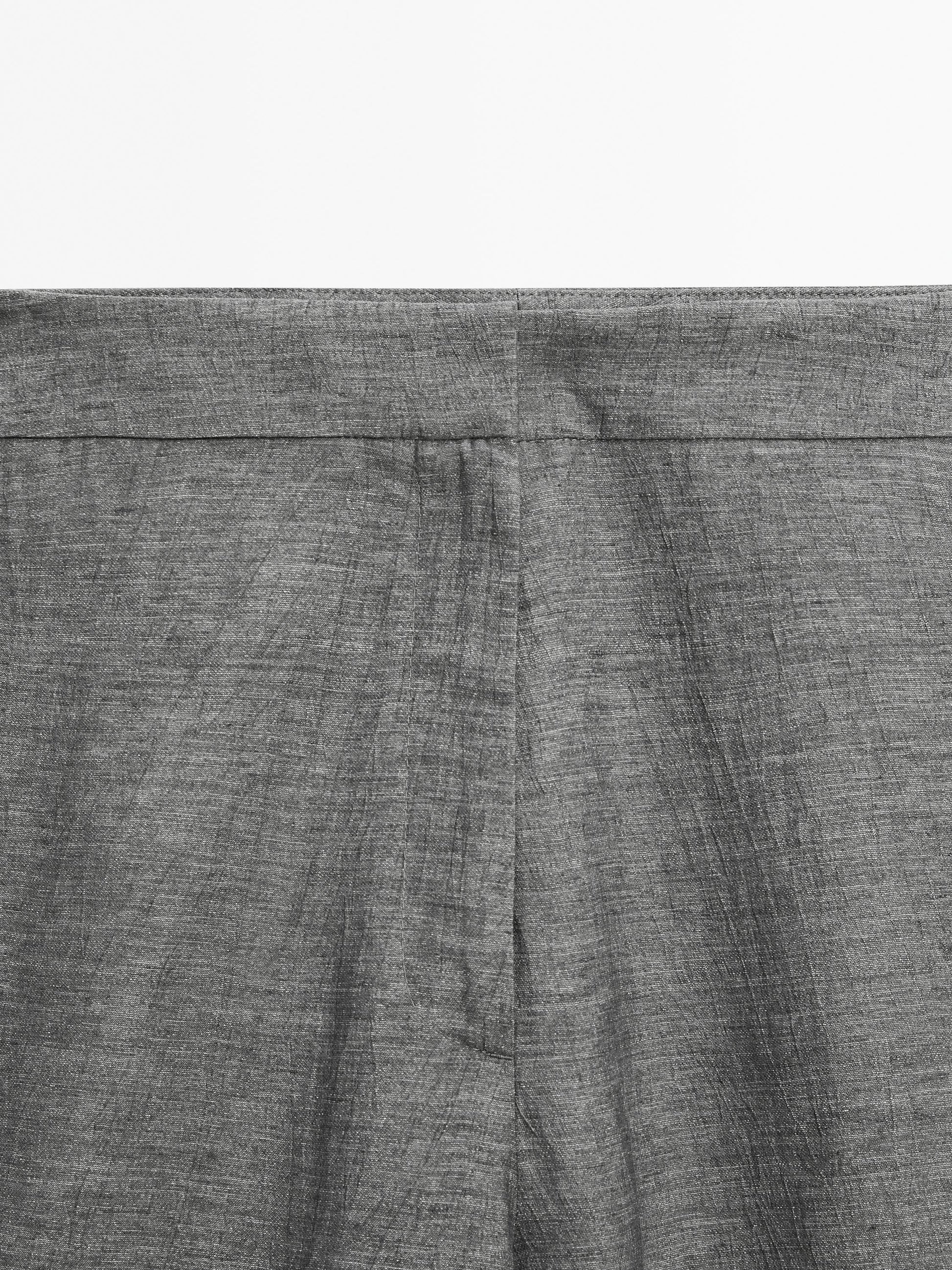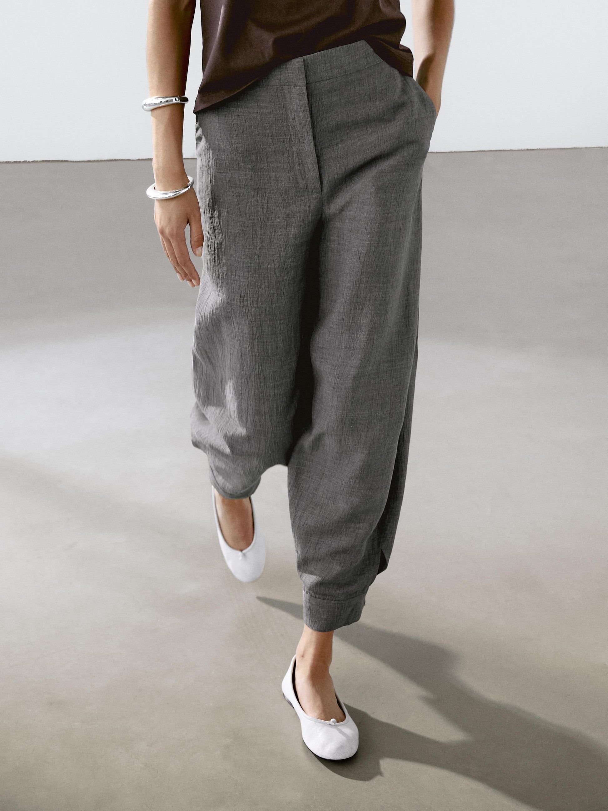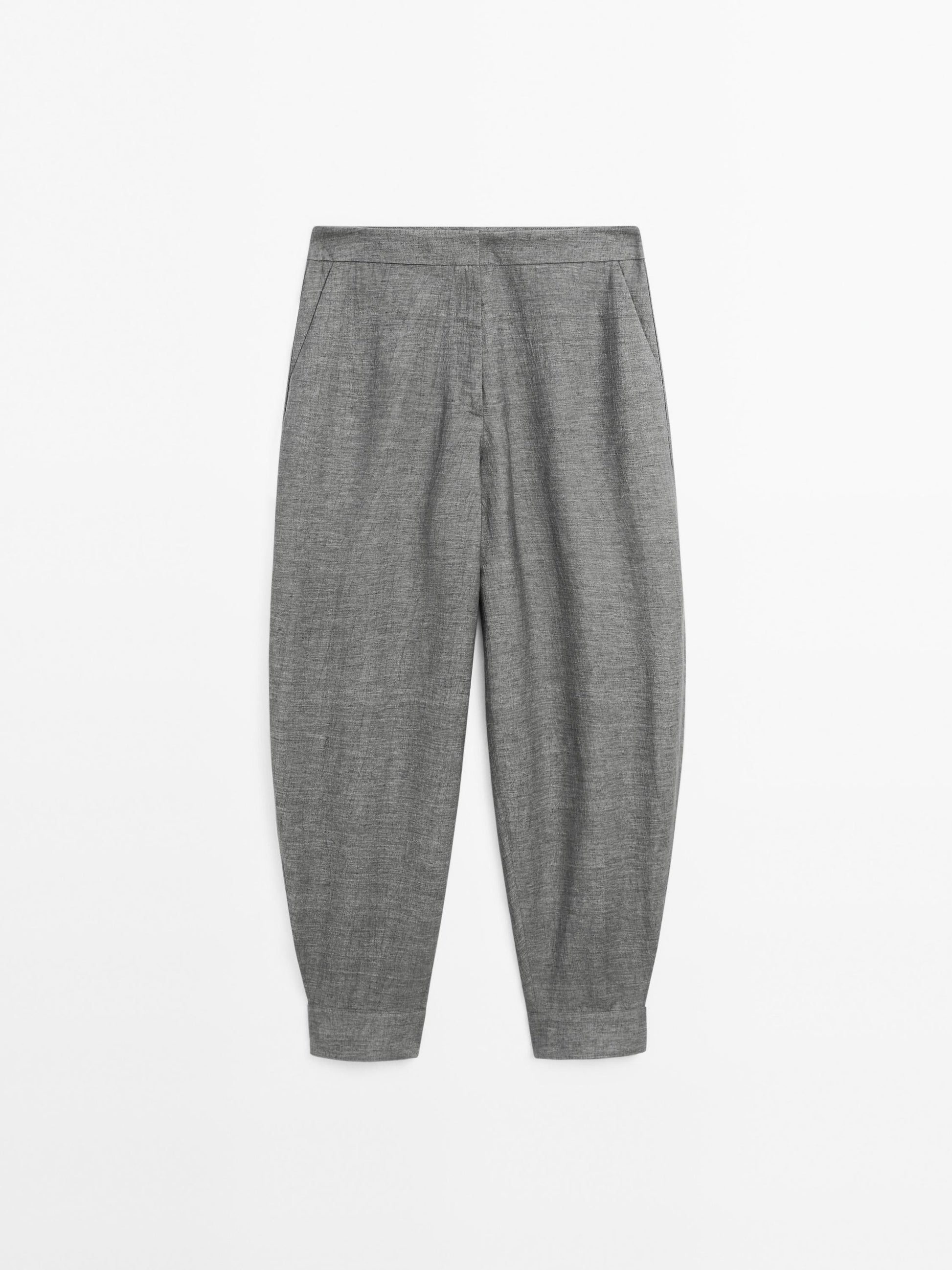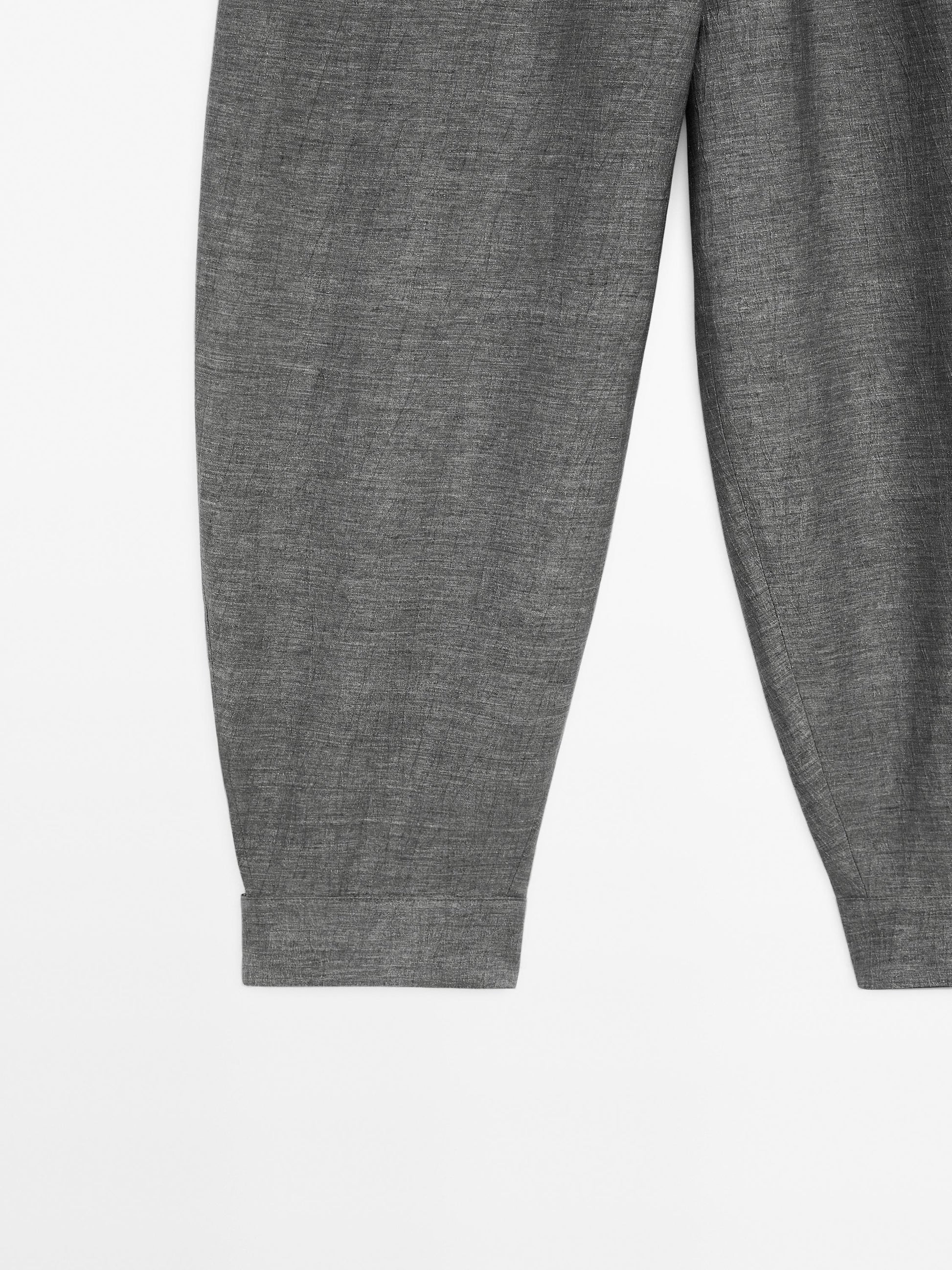 Balloon fit trousers loose-fitting silhouette, wide leg volume and ankle fit. Mid-waist. Two side pockets. Buttons on the hem. Matching garment available.