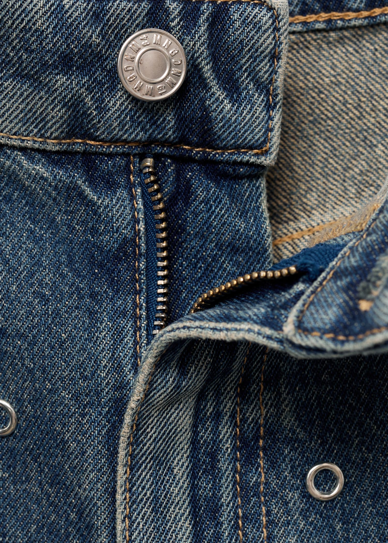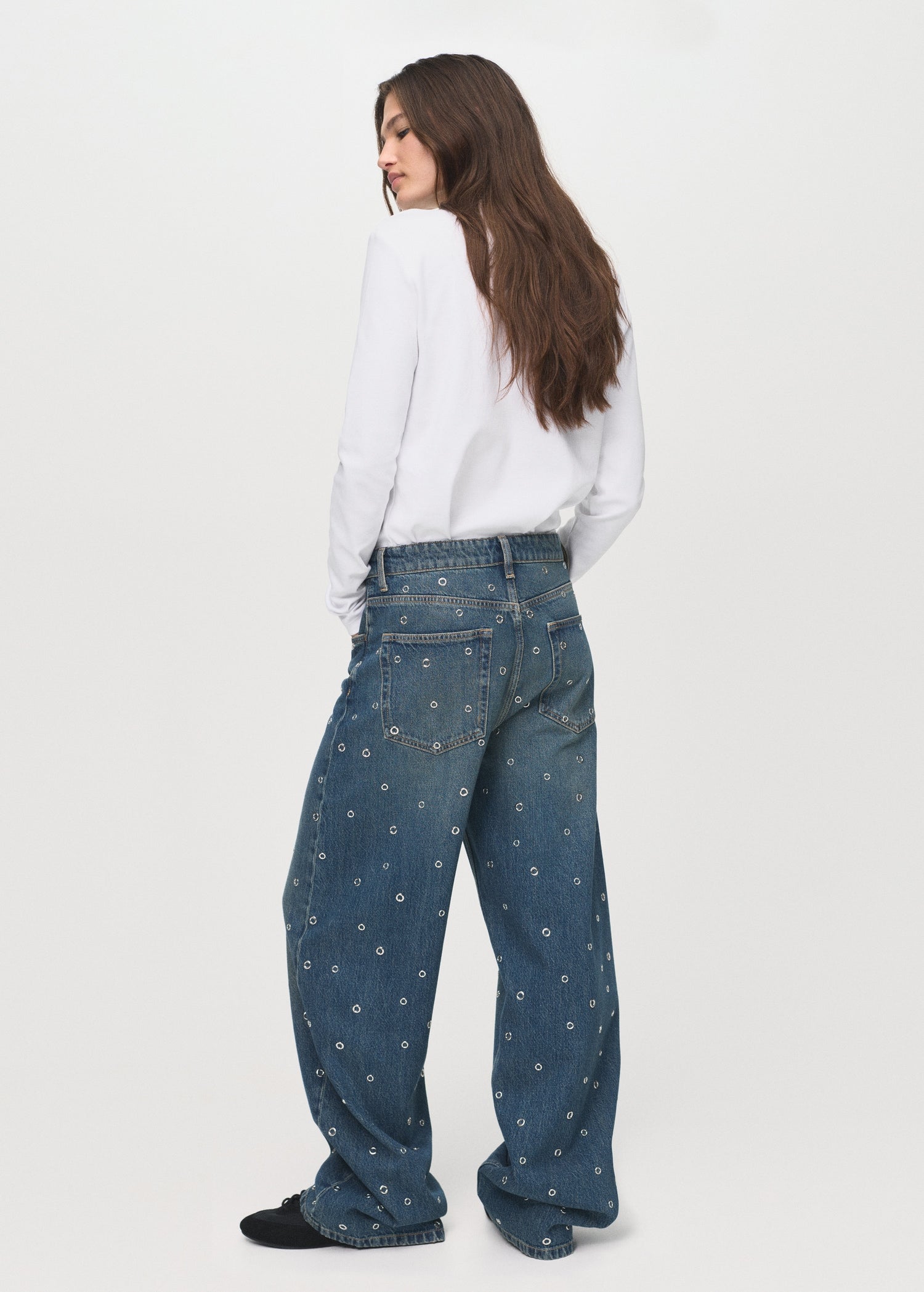 Denim-style cotton fabric. Long Design. Balloon design. Eyelets design. Mid-rise. Belt loops. Five pockets. Button and zip fastening. Inside length 79 cm.