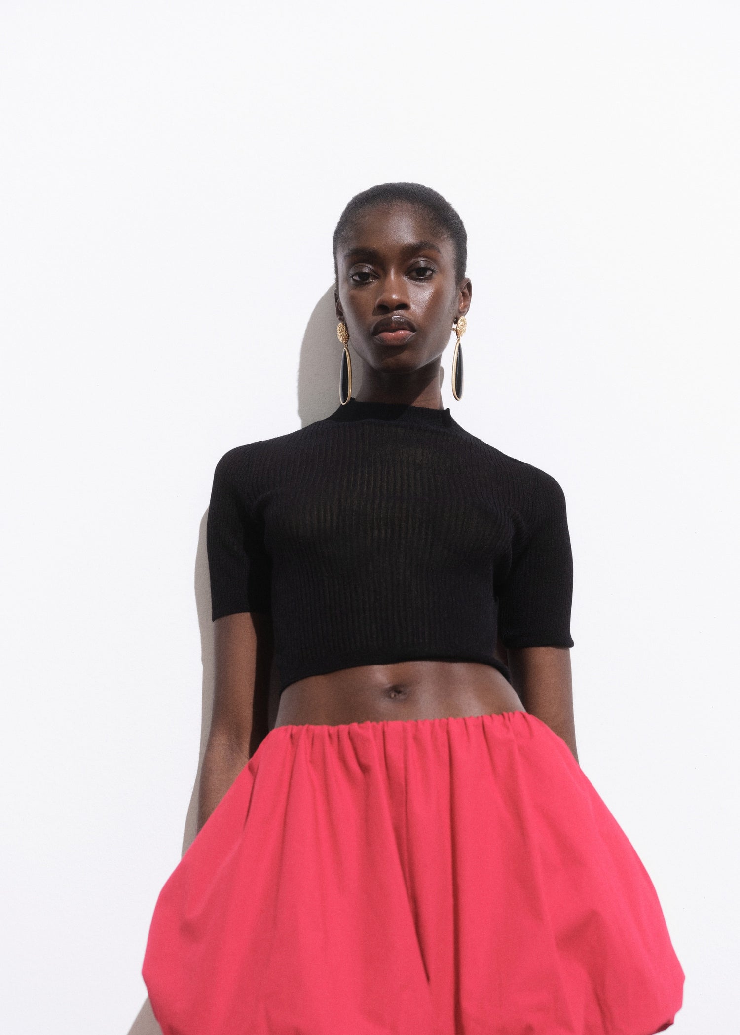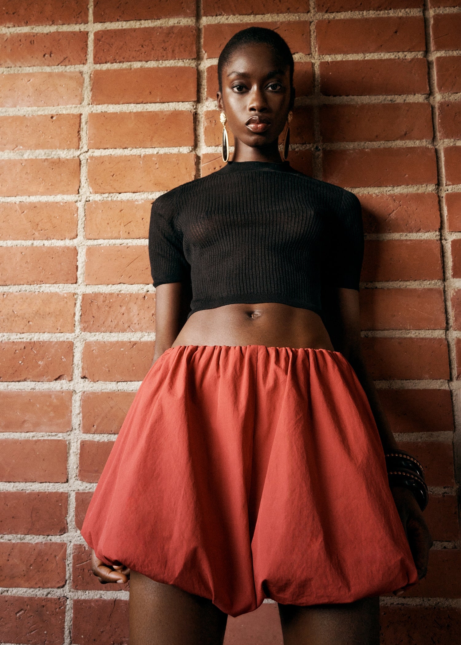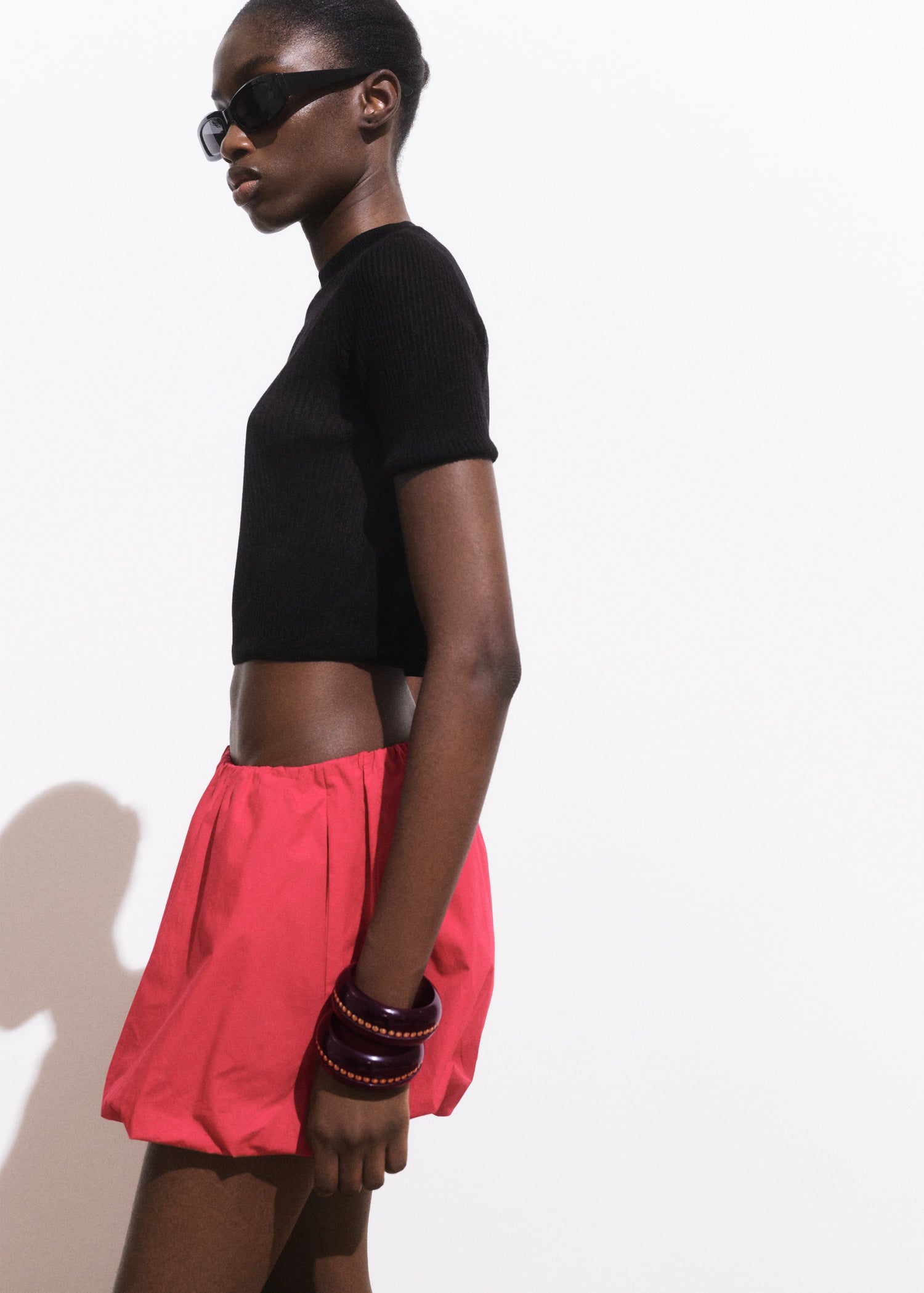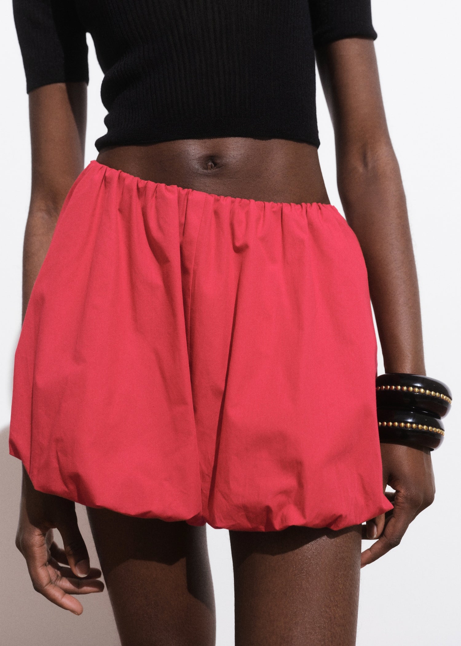 100% cotton fabric. Short design. Bubble hem. Two side pockets. Elastic waist. No fastening. Inner lining. Total look.
