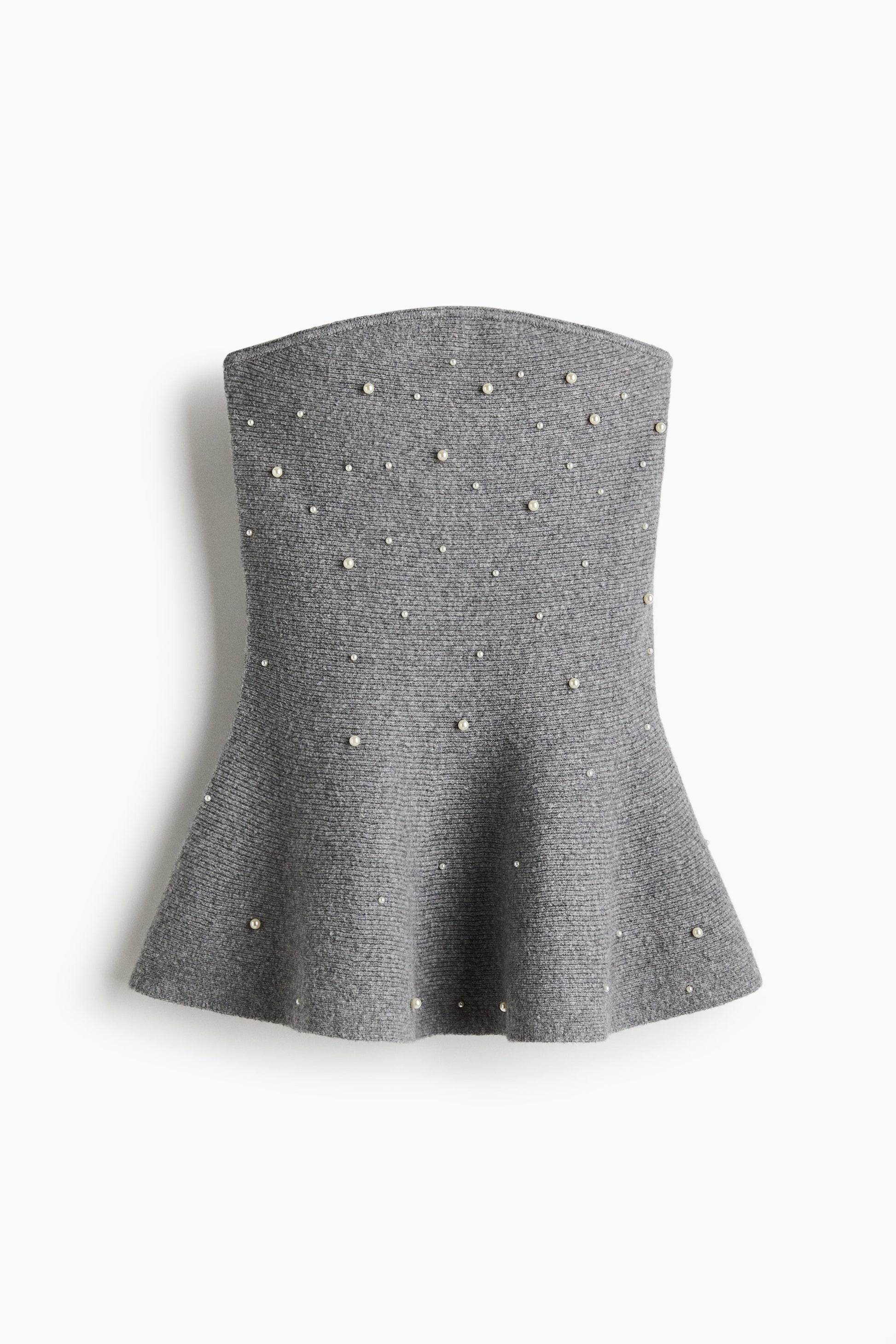 Fitted bandeau top in a soft knit embellished with beads in different sizes. Concealed silicone trim at the top and a flared peplum for a flattering silhouette.