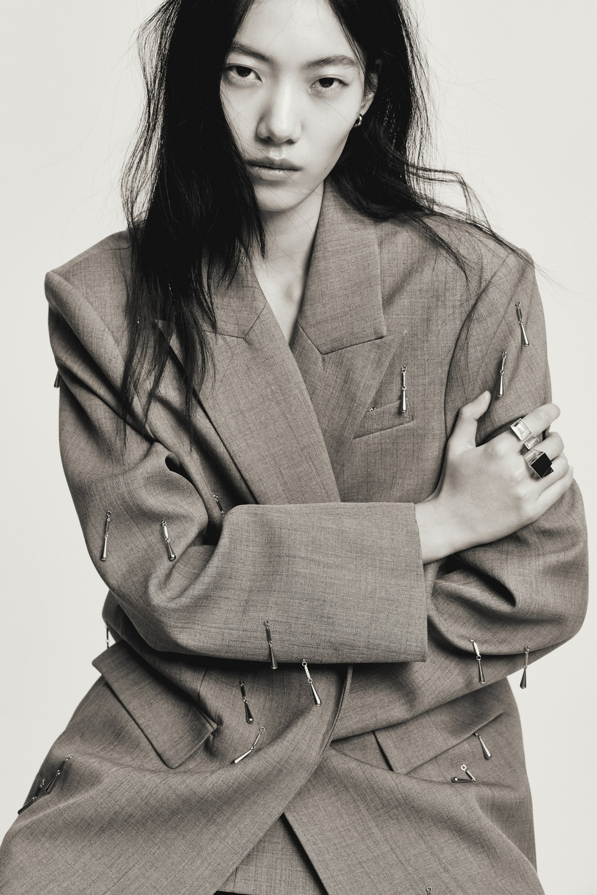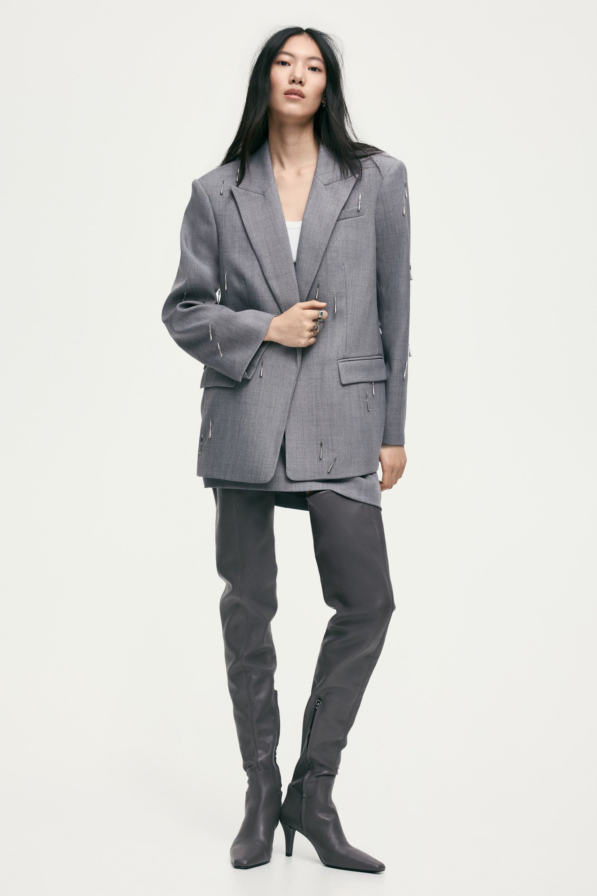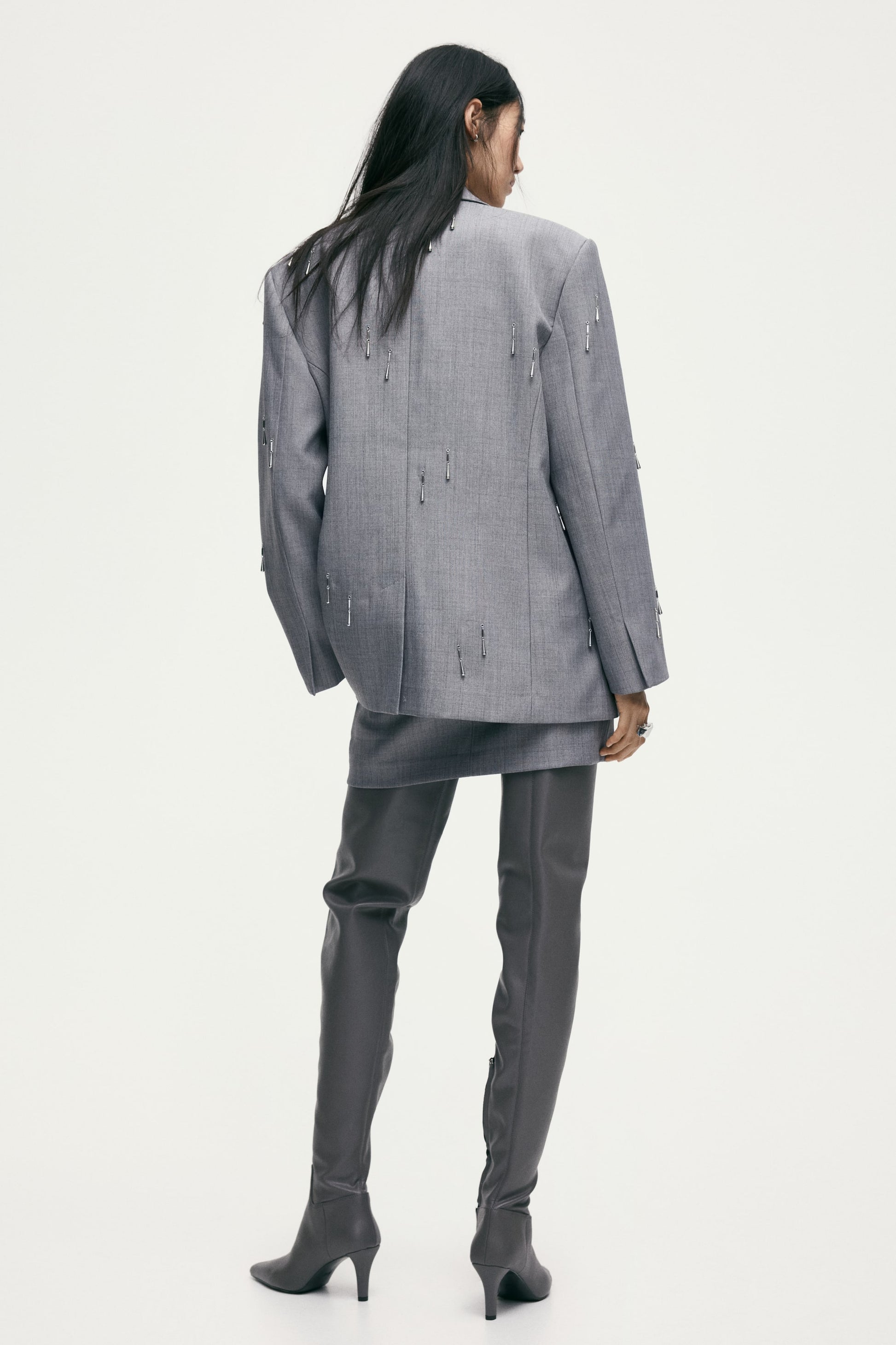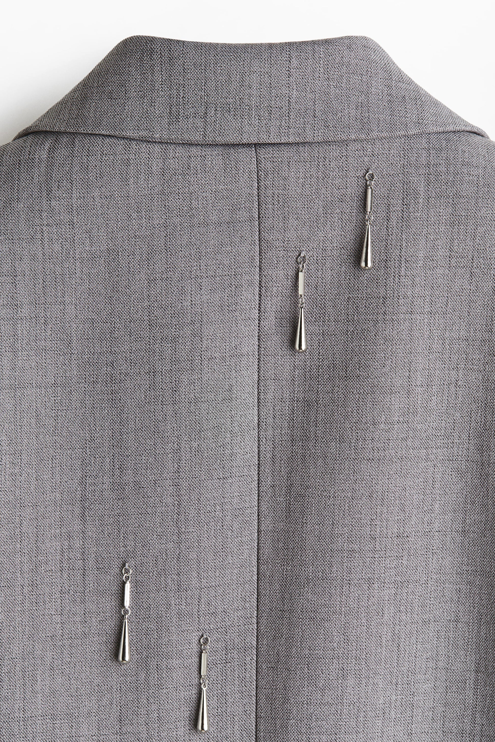 Oversized blazer in woven fabric adorned with silver-coloured bead pendants, evenly spread across the garment. Thick shoulder pads, peak lapels and a concealed button at the front. Welt chest pocket, jetted front pockets with a flap and a jetted inner pocket with a button. Slit at the cuffs and a single back vent. Lined.