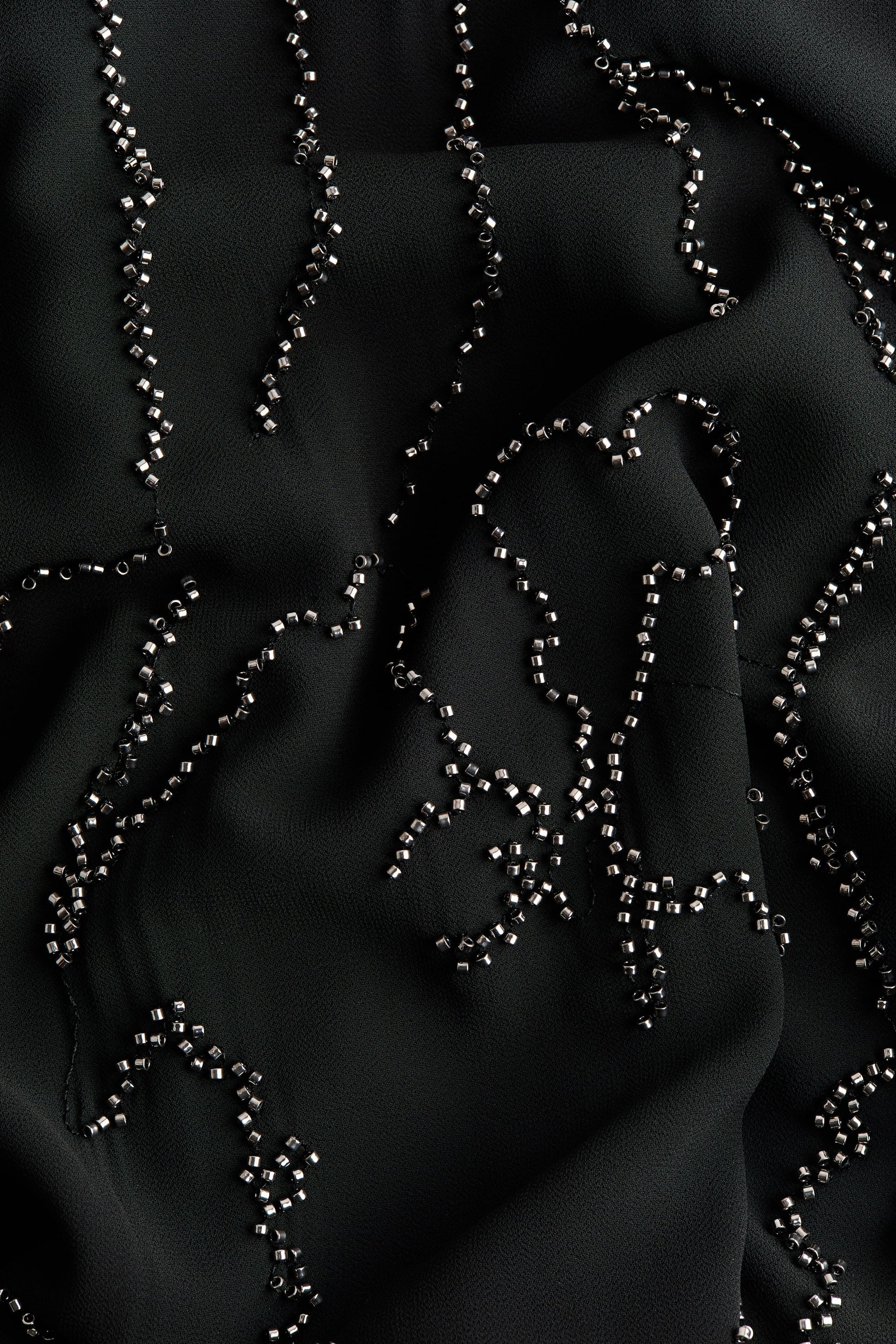 Long-sleeved maxi dress in chiffon embellished with shiny bugle beads. Stand collar, concealed zip at the back and a straight-cut hem with a back slit. Lined.
