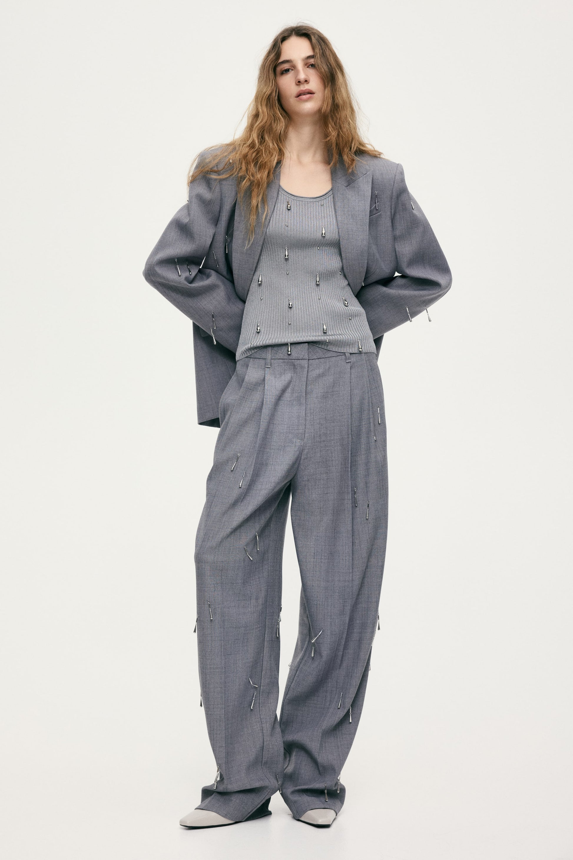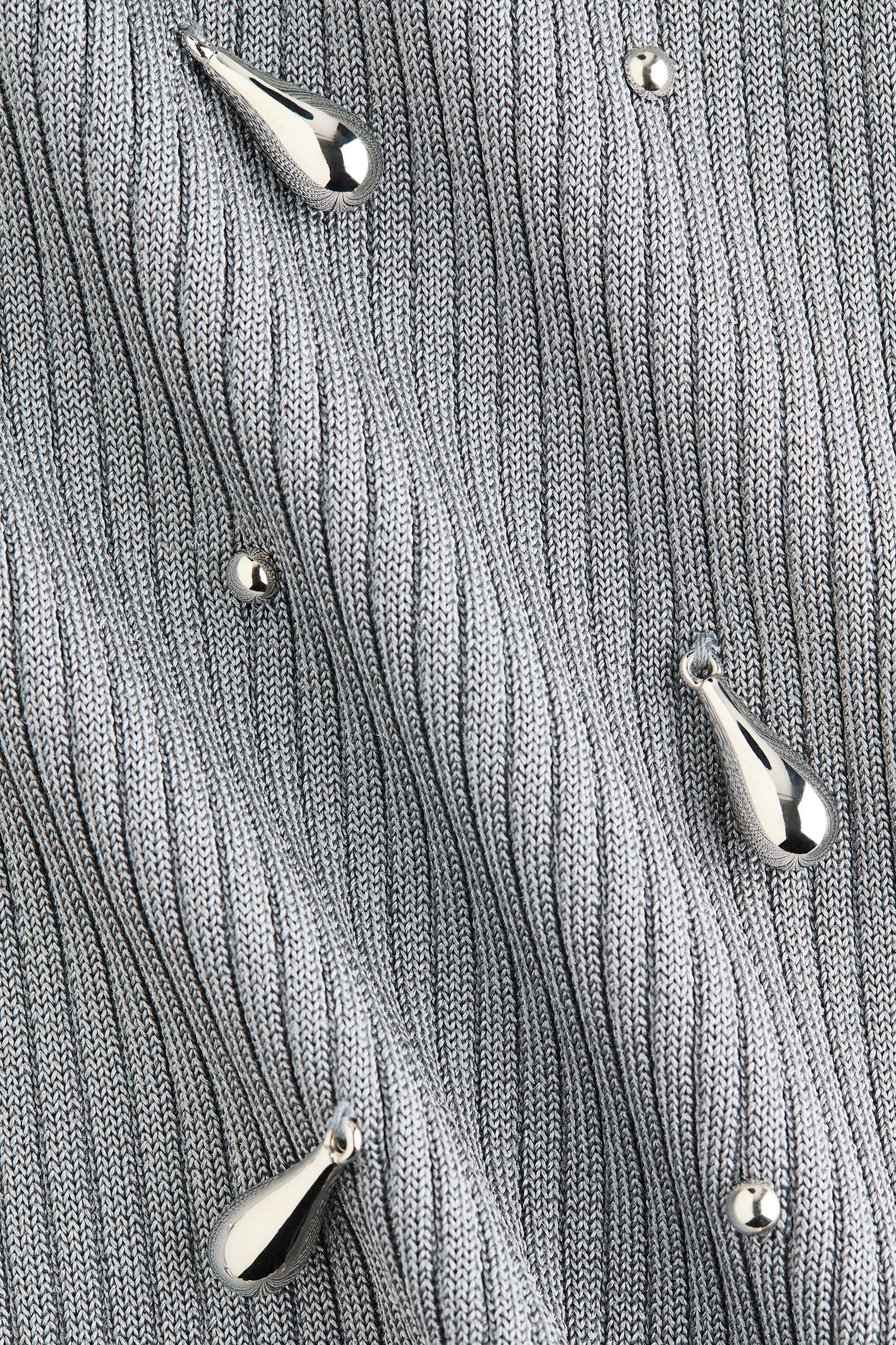 Fitted vest top in a fine rib knit embellished with small, spherical beads and larger, teardrop shaped beads. Round neckline with a roll edge.