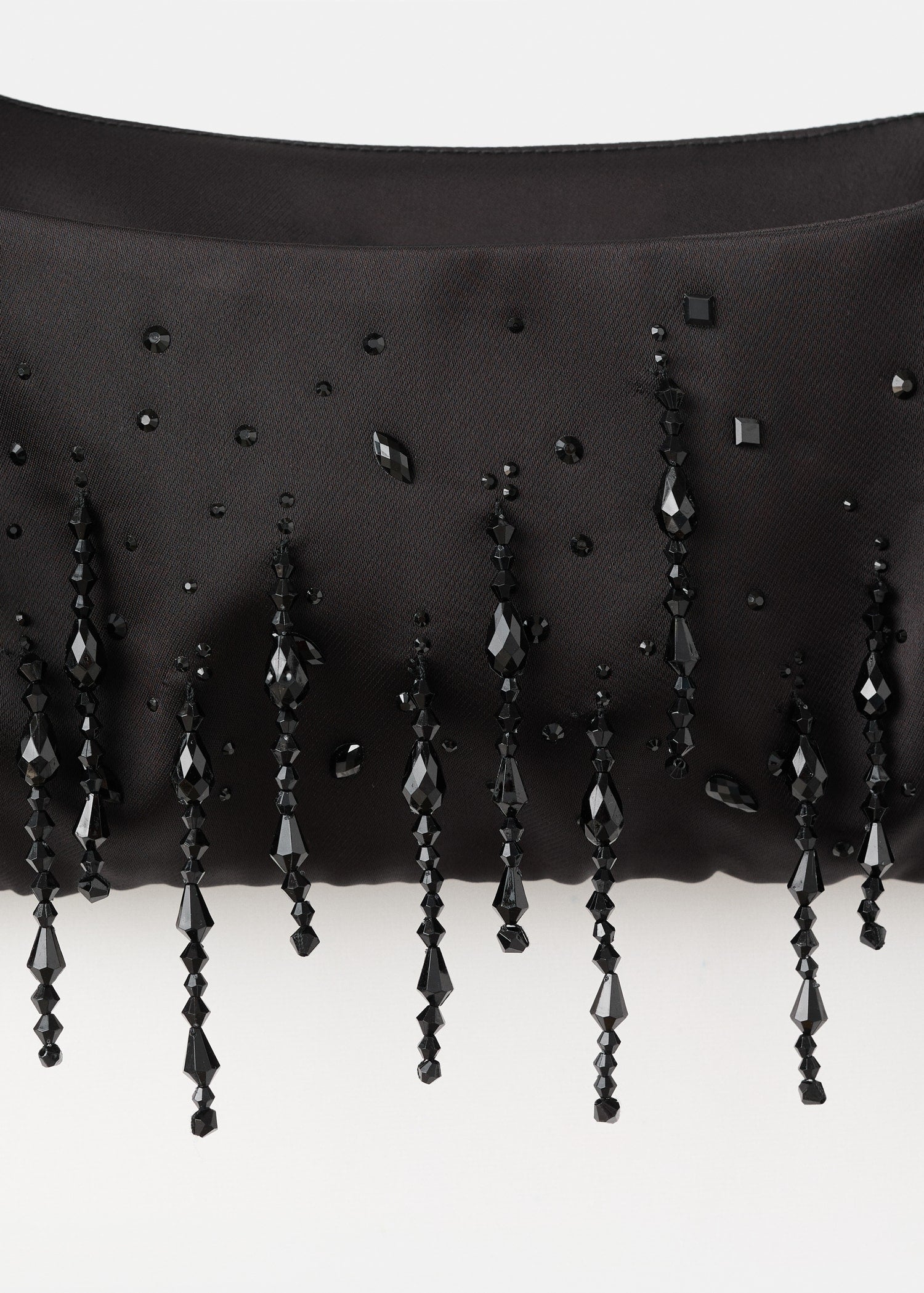 Crafted from satin fabric, this cropped design features a plunging neckline and wide straps. The hanging beads add a distinctive touch, while the elastic panel at the back ensures comfort.