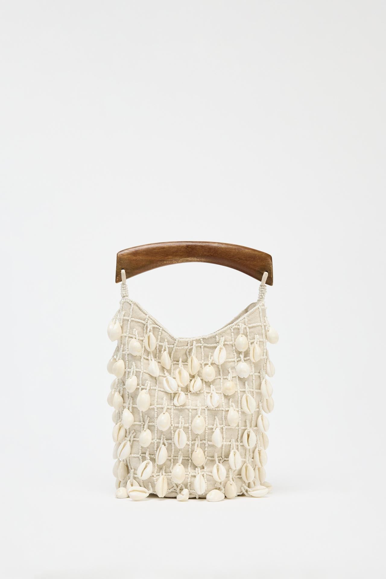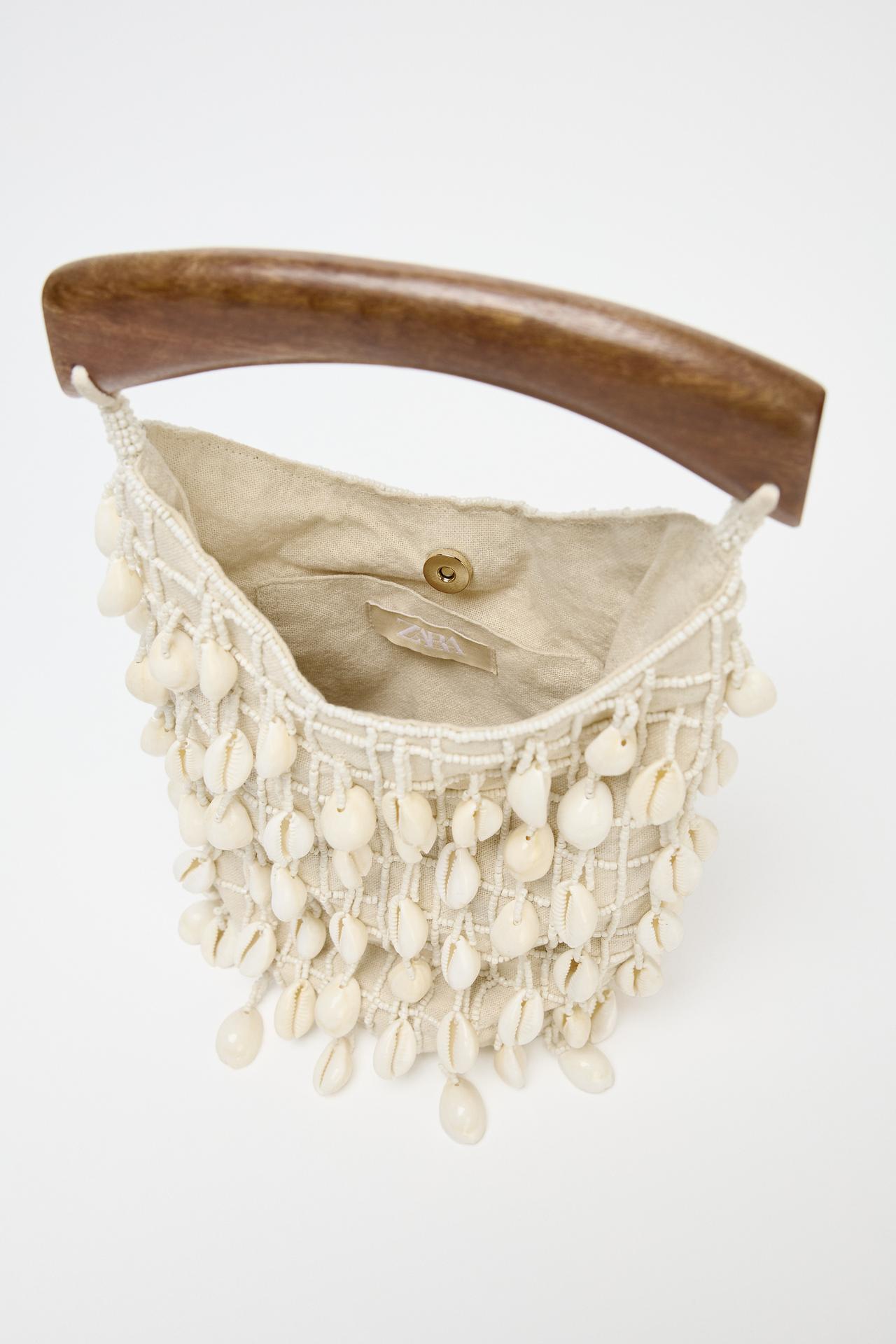 Fabric bucket bag with embroidered and beaded detail on the top. Rigid top handle. Inner pocket. Magnetic button fastening.