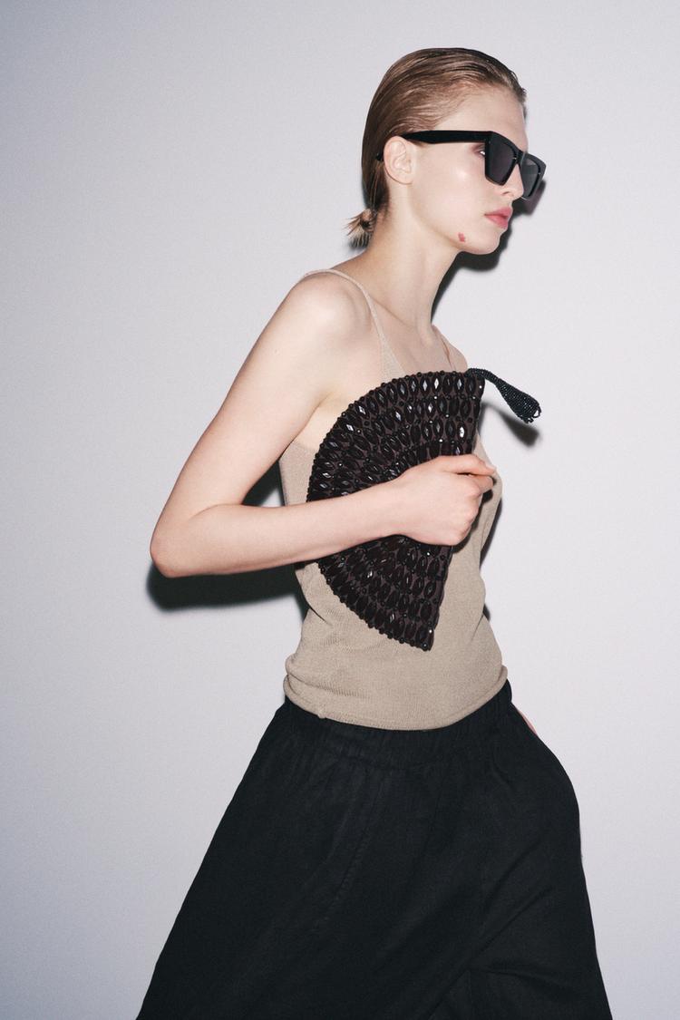 Fan-shaped handbag made from 100% cotton yarn. Appliqu detail with beads in different shapes and sizes. Contrasting interior lining with pocket. Metal zip closure and pompom appliqu.