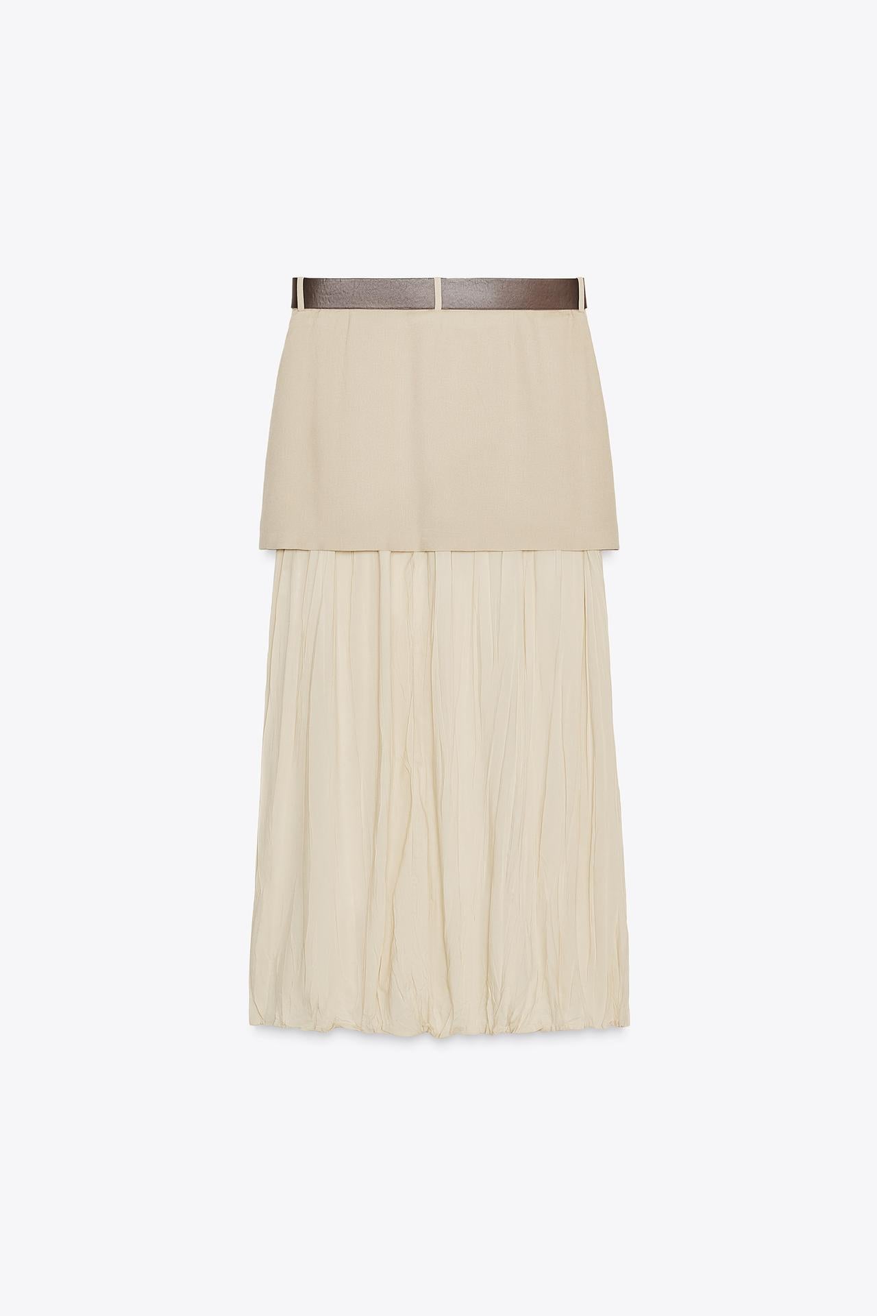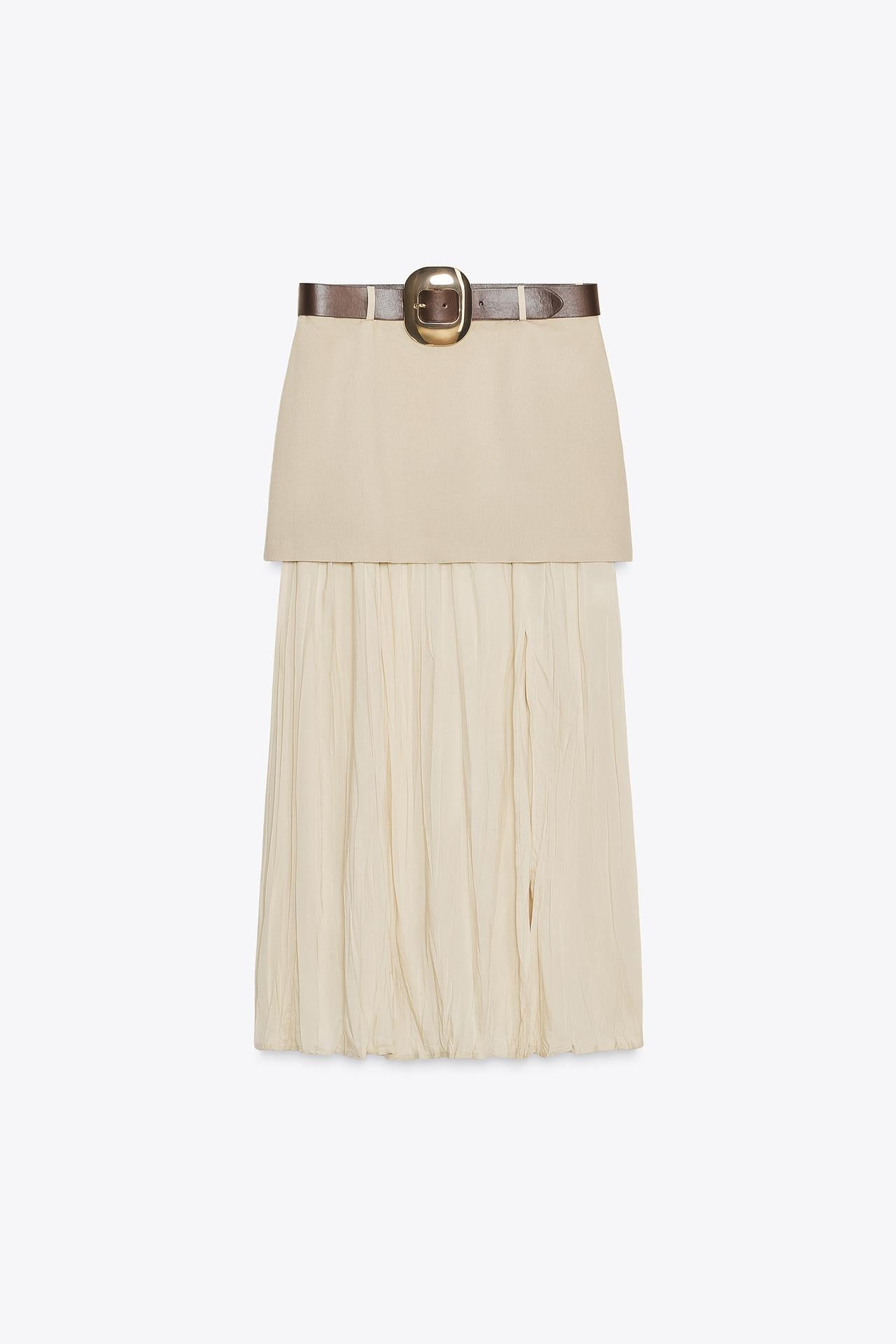 Midi skirt made in a combination fabric. Hem with side slit. Matching belt with metal buckle. Side zip fastening concealed in the seam.