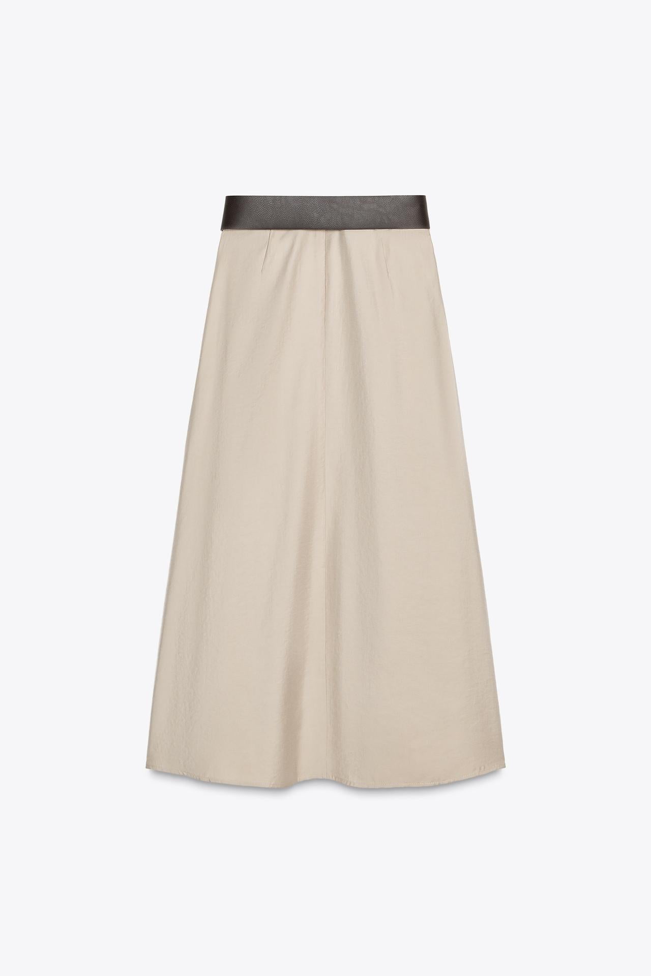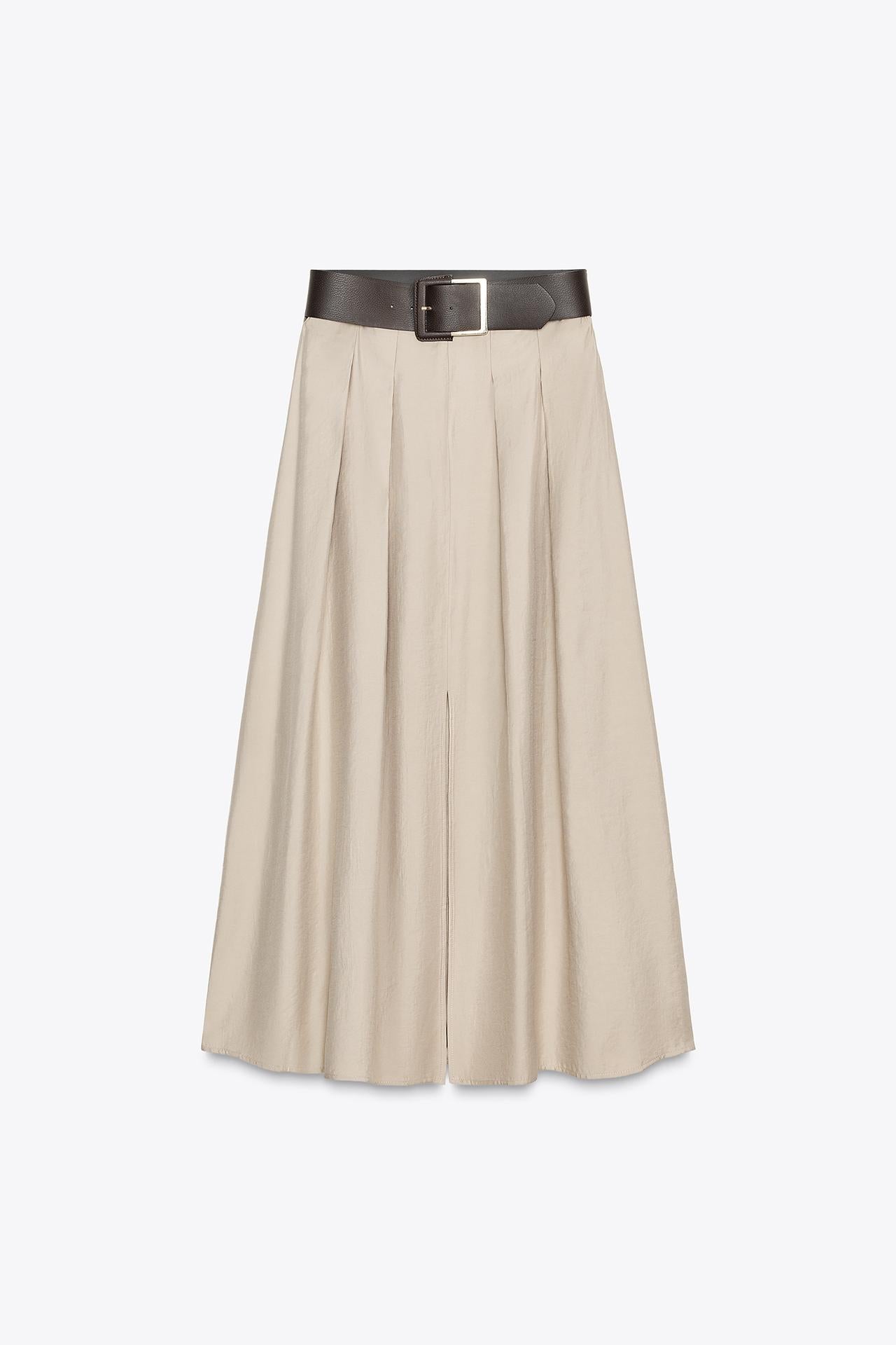 High-waist midi skirt with belt loops. Pleated detail. Hem with front vent. Belt with metal buckle. Side zip fastening concealed in the seam.