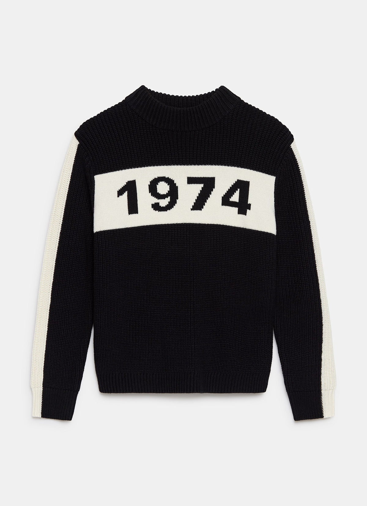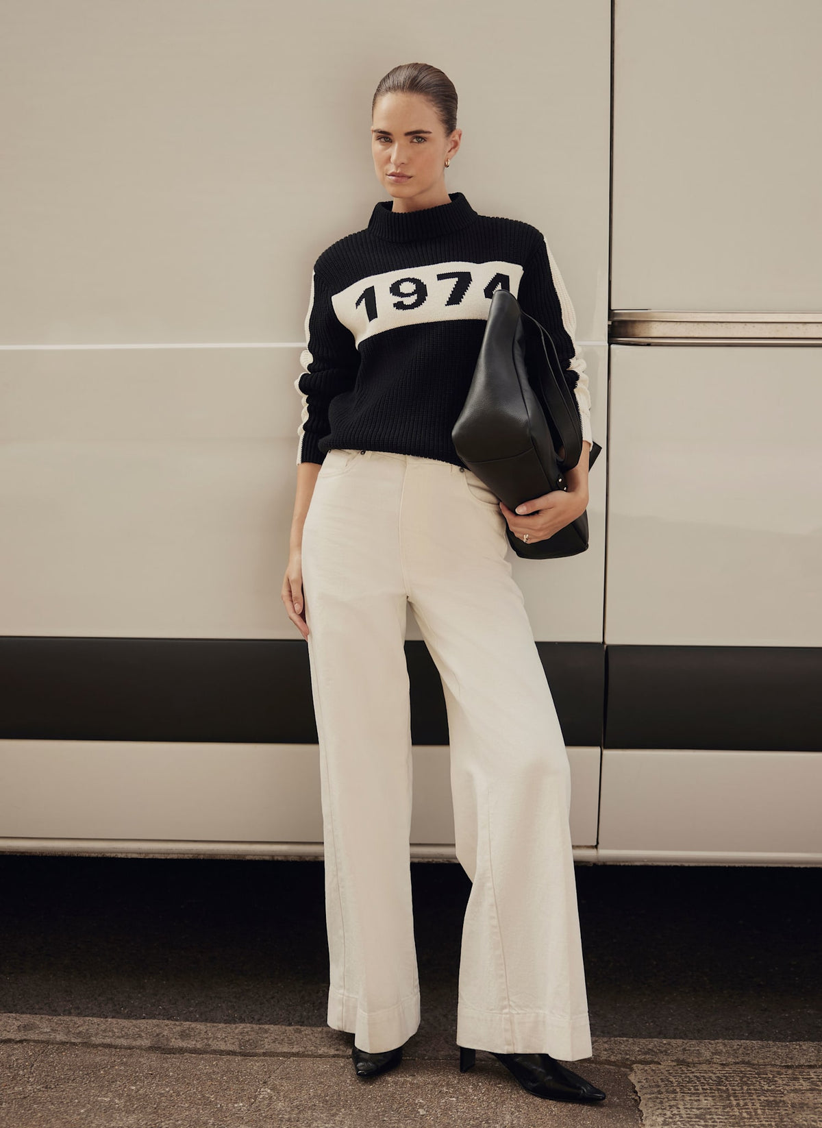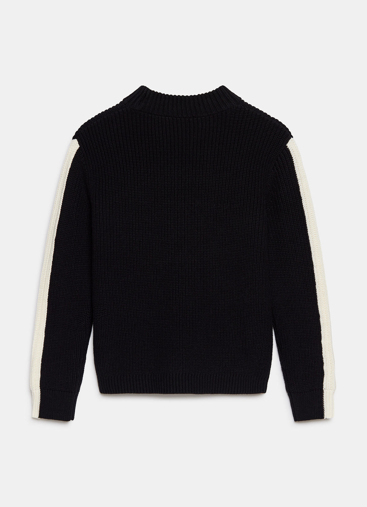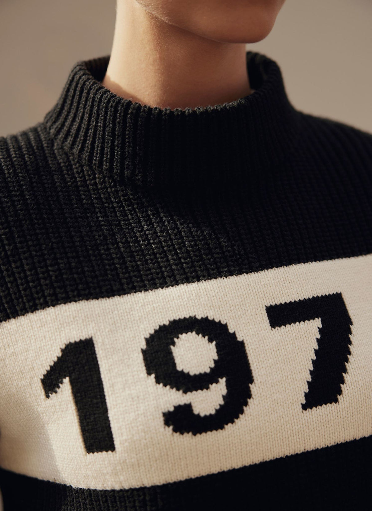 - Black knit jumper featuring a crew neckline, long sleeves, side stripe sleeves with a graphic motif across the front.