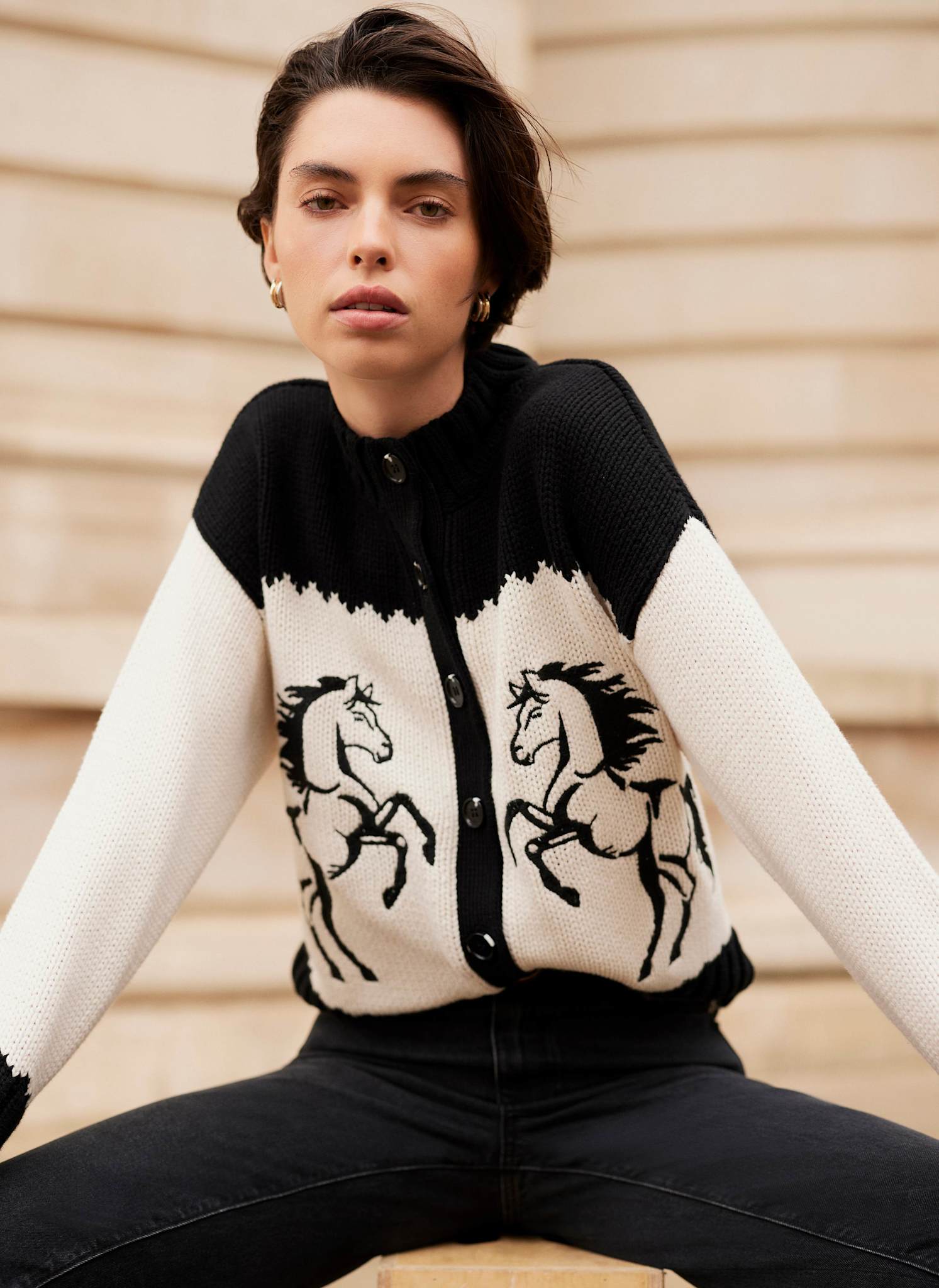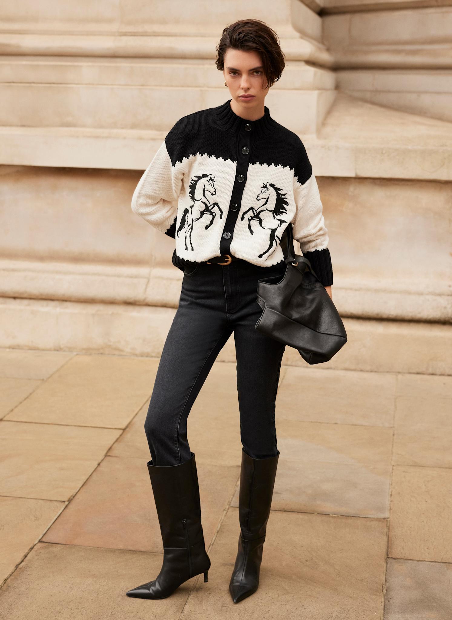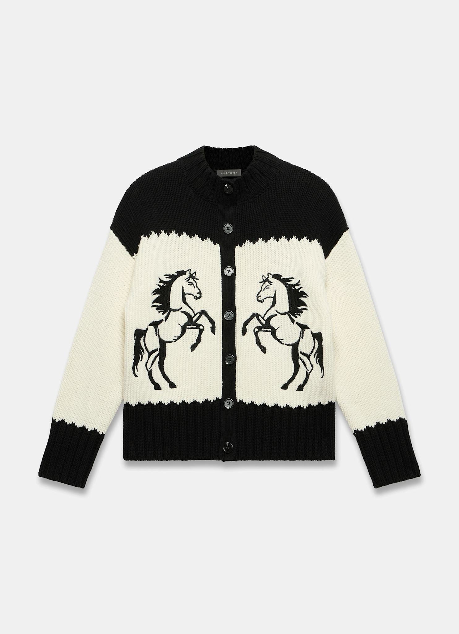 - Black cardigan featuring a crew neckline, long sleeves, horse motifs and a button fastening through the front.
