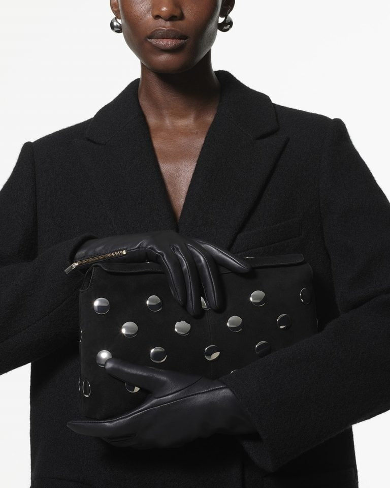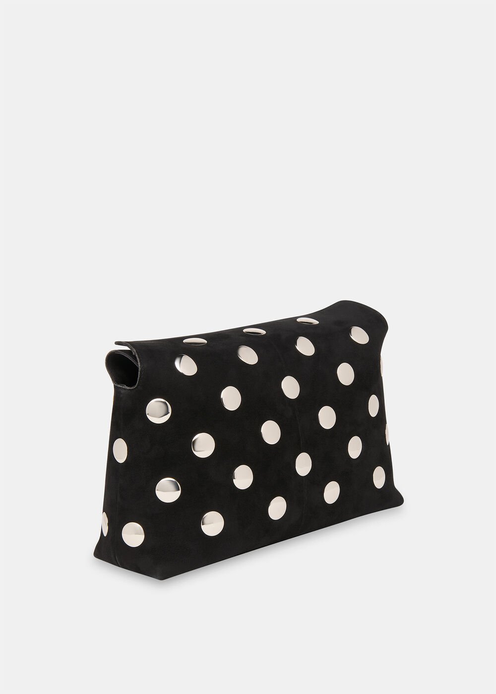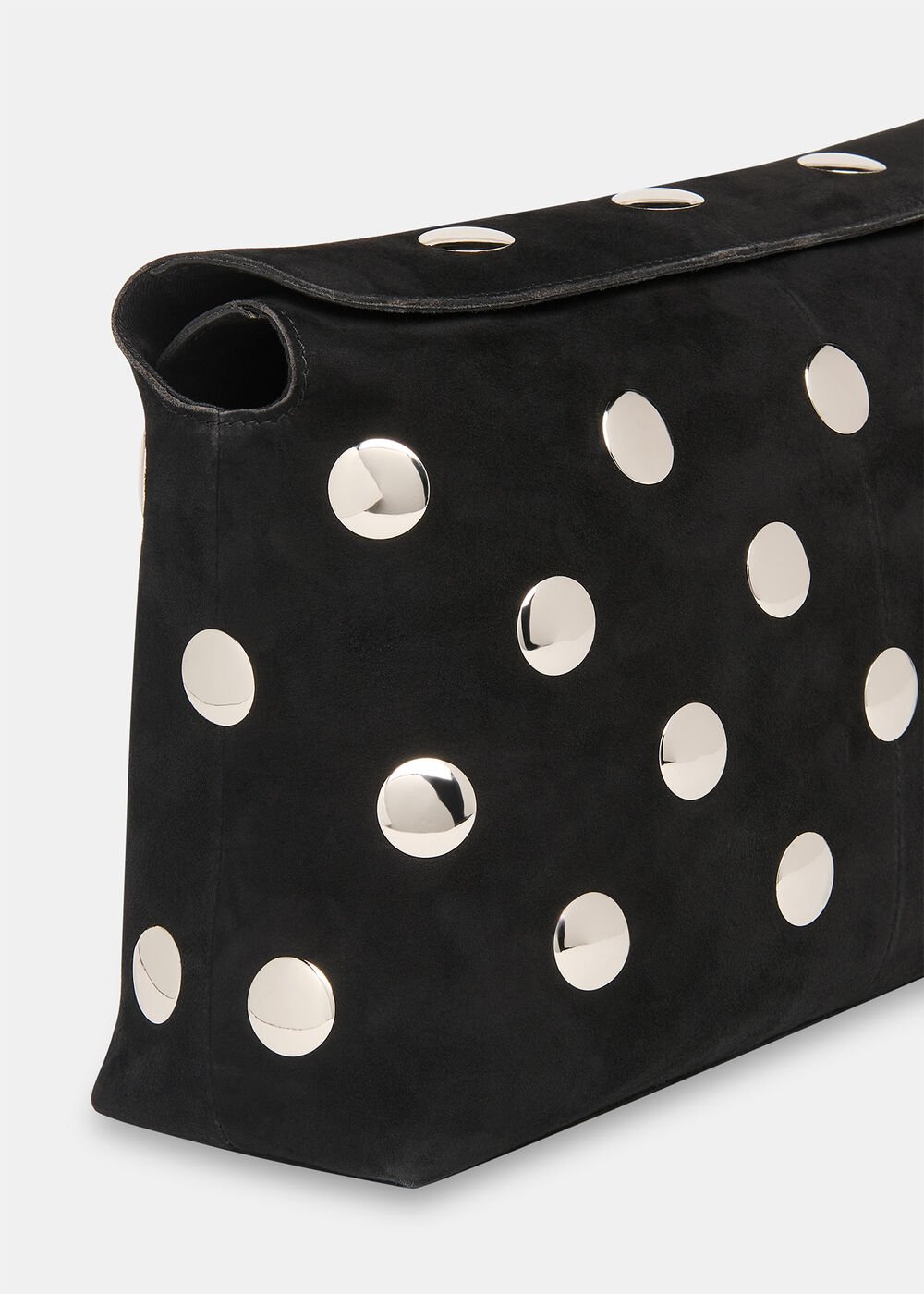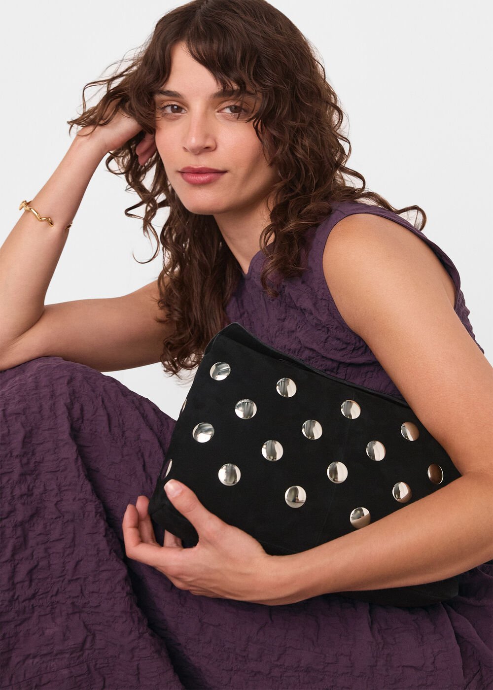 Our Fia Studded Foldtop Clutch Bag is a chic update to the classic black clutch. Its accentuated with silver stud details that contrast against the soft black suede, complemented by a magnetic foldtop to keep all your essentials secure.