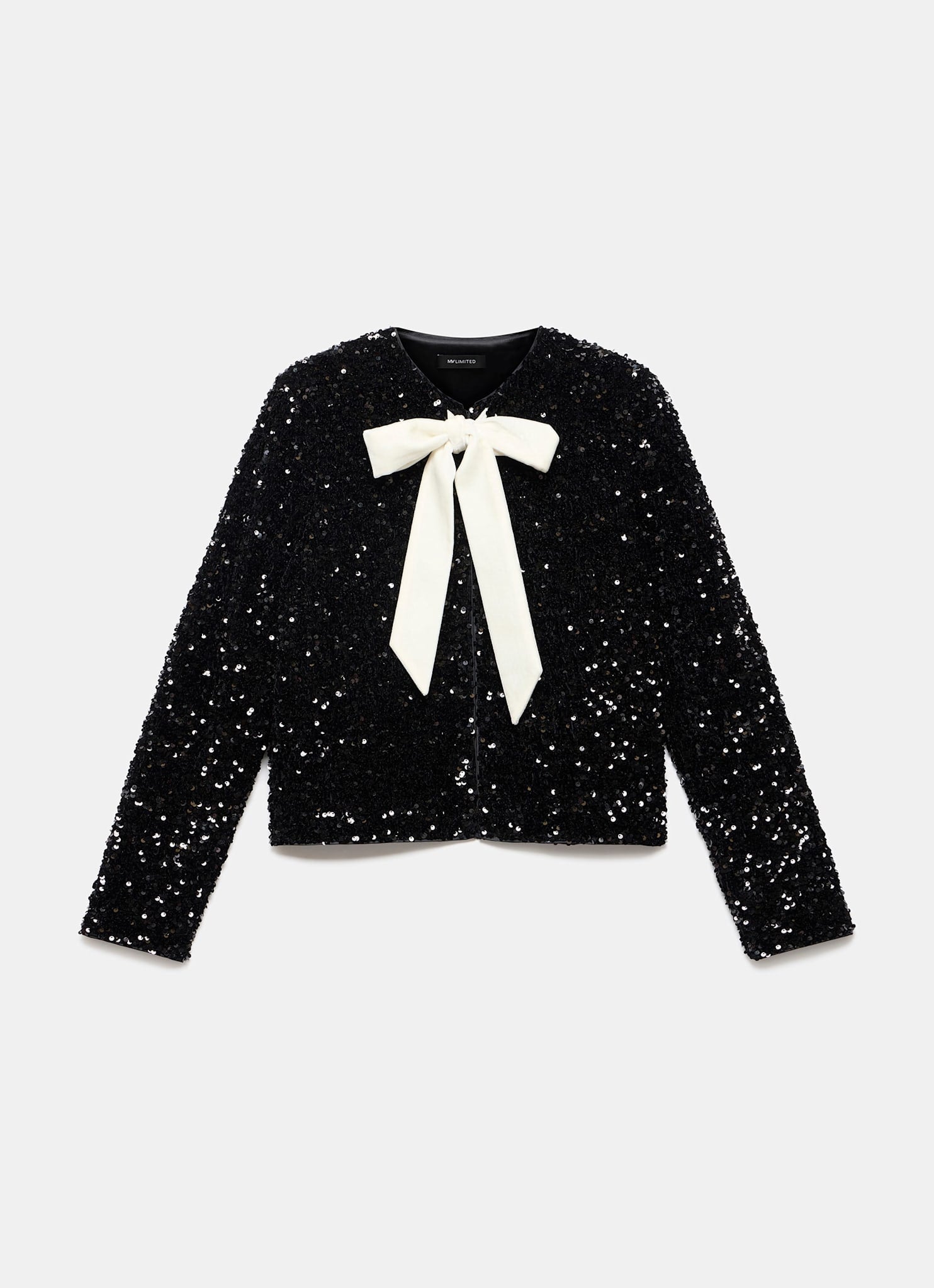 - Black sequin jacket featuring a crew neckline, long sleeves and contrast bow fastening through the front.