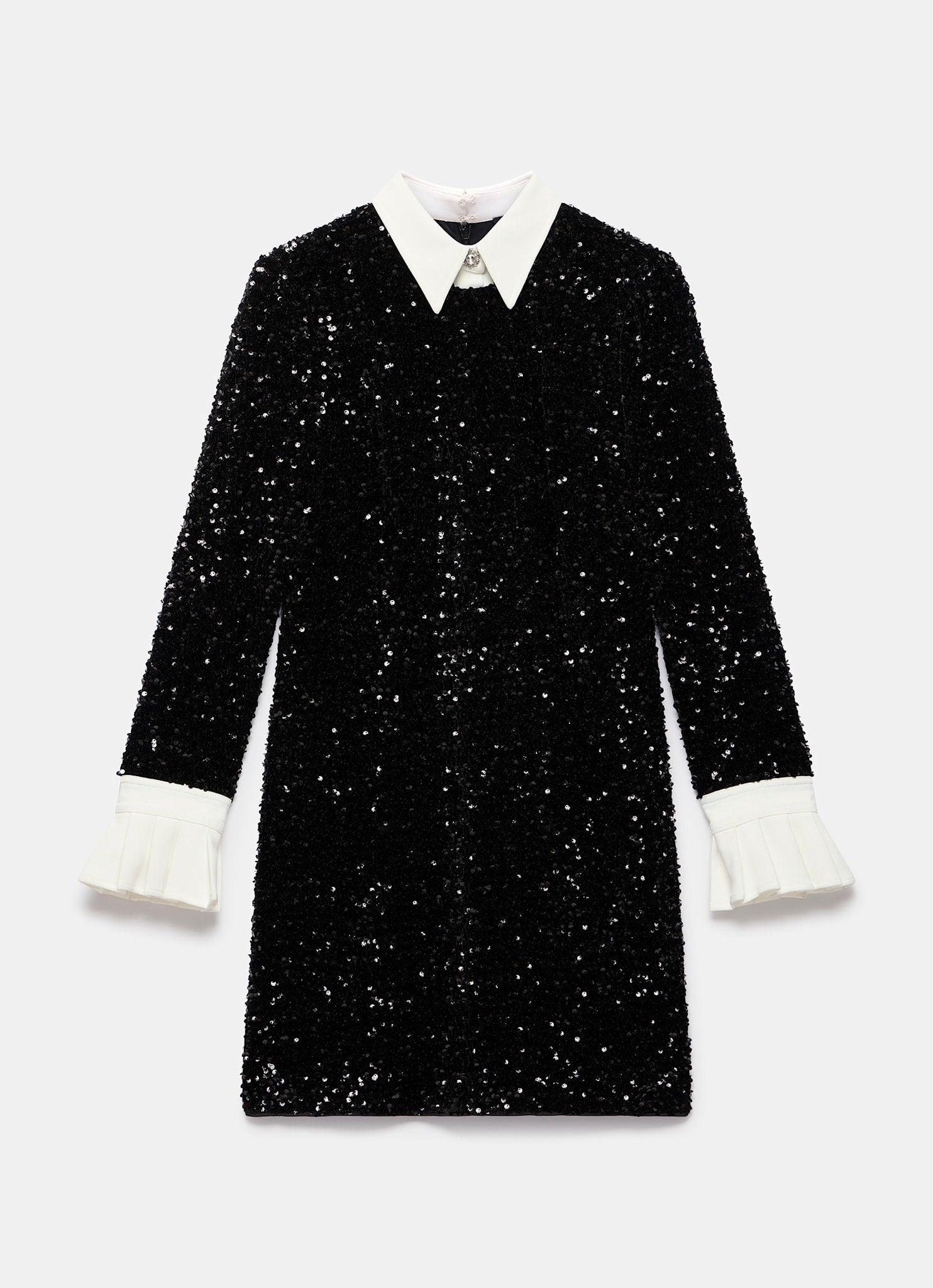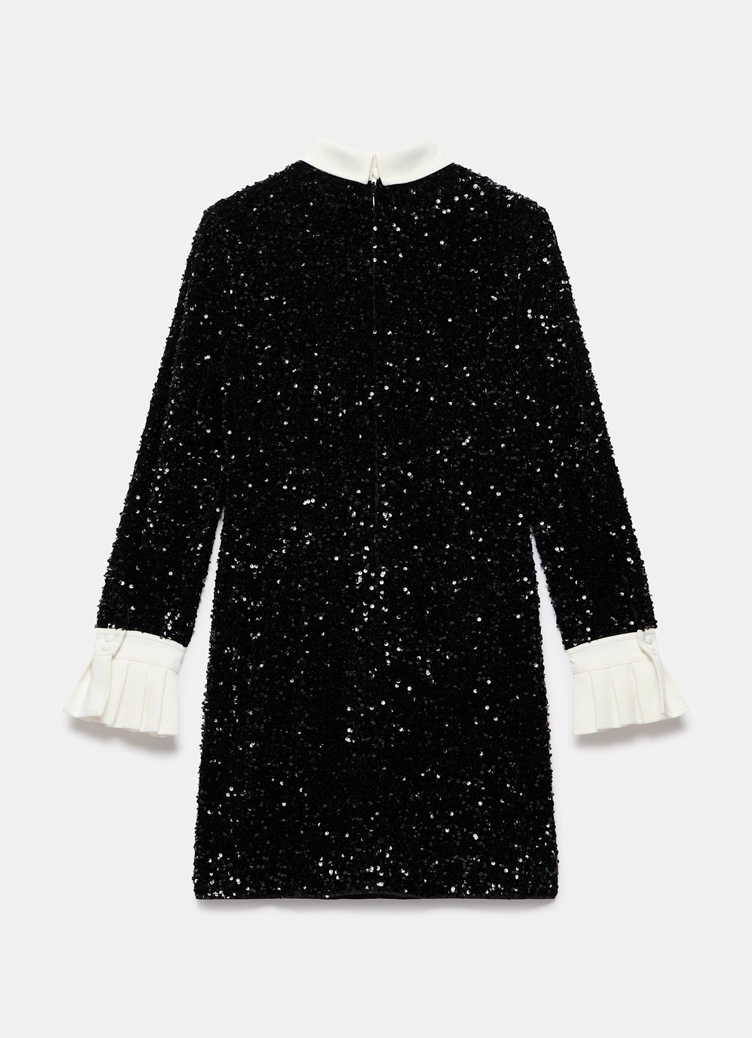 - Black layered effect dress in a mini silhouette featuring a classic collar, crystal button, long sleeves, fluted pleat buttoned cuffs, sequin embellishment with a zip fastening through the back.