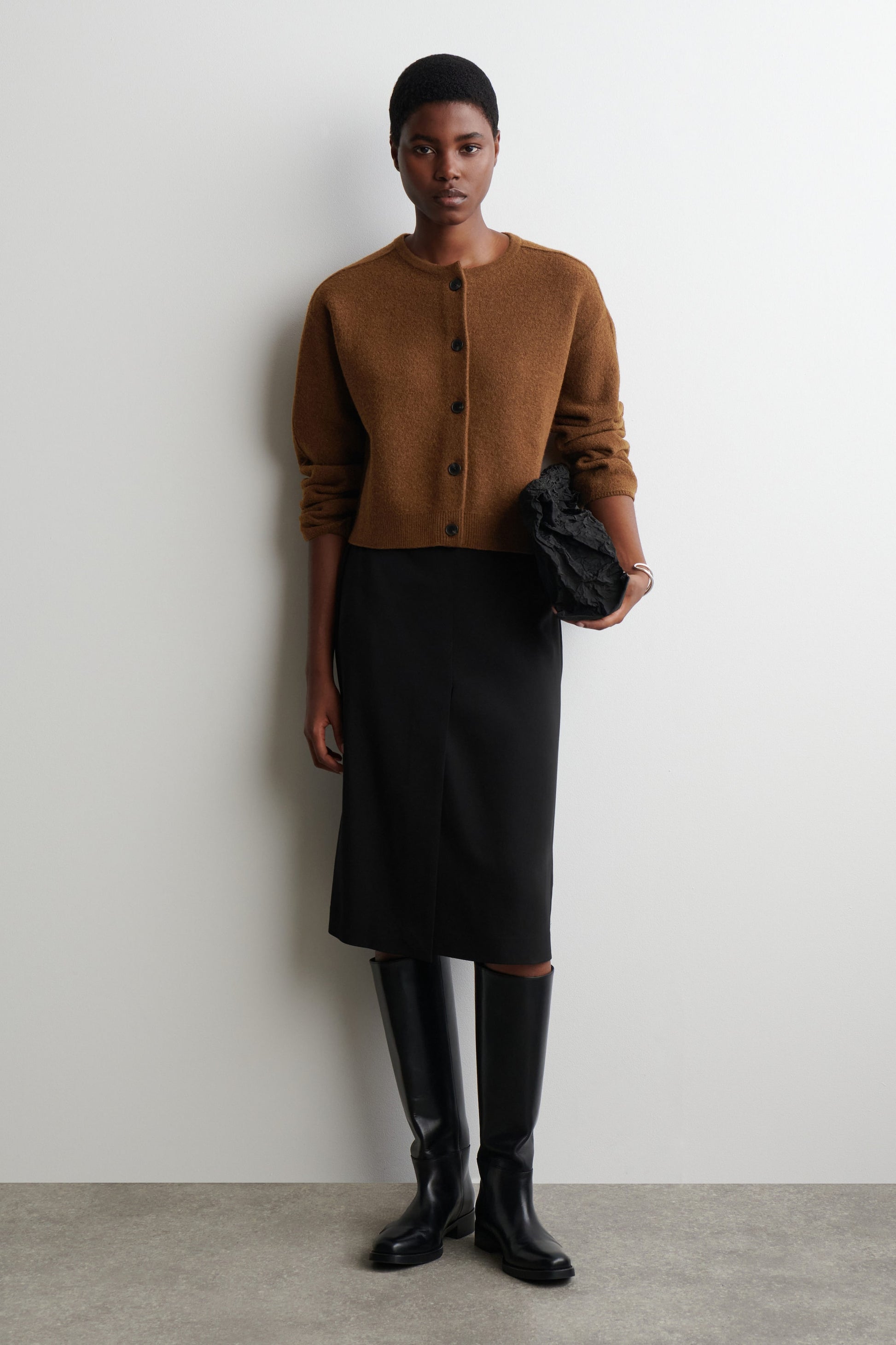 Refined silhouettes and luxuriously tactile yarns define the COS knitwear collection. Rendered in a rust-brown tone, this crew-neck cardigan is made from premium merino wool that's boiled for texture and designed in a rounded shape with overlapping seams at the shoulders.