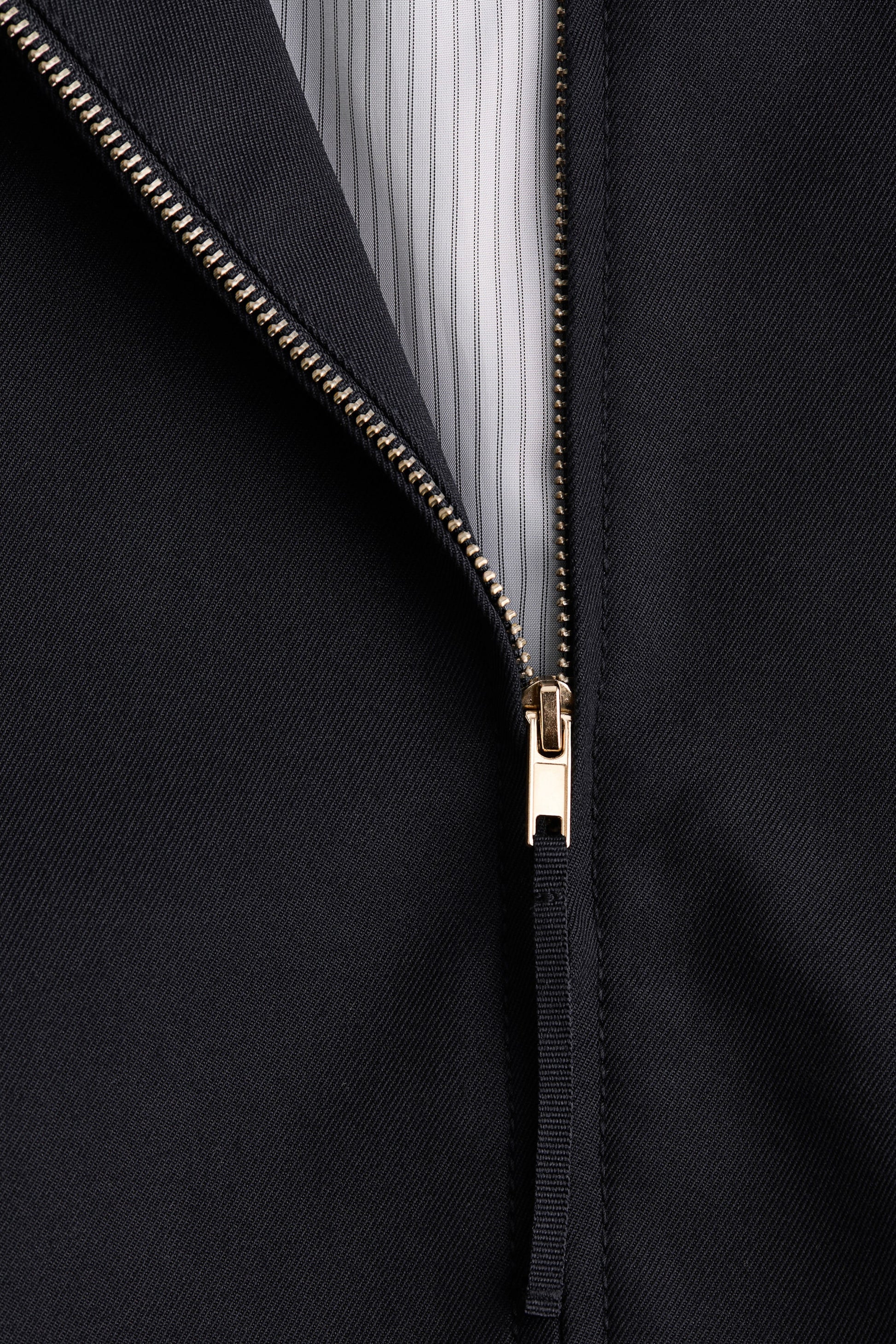 Bomber jacket in woven fabric with a stand collar, concealed two-way zip down the front and discreet side pockets. Covered elastication at the cuffs and at the back of the hem. Lined.