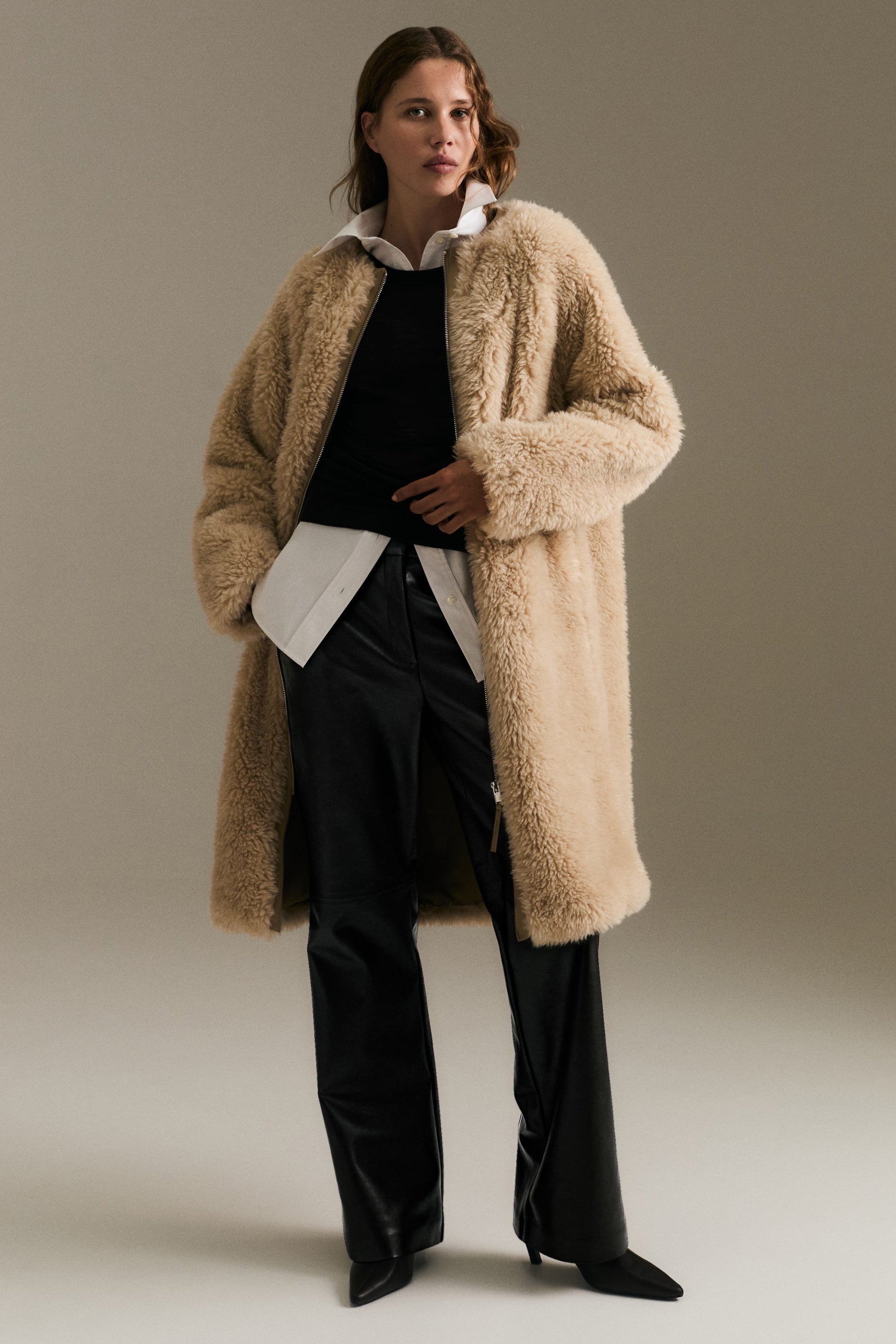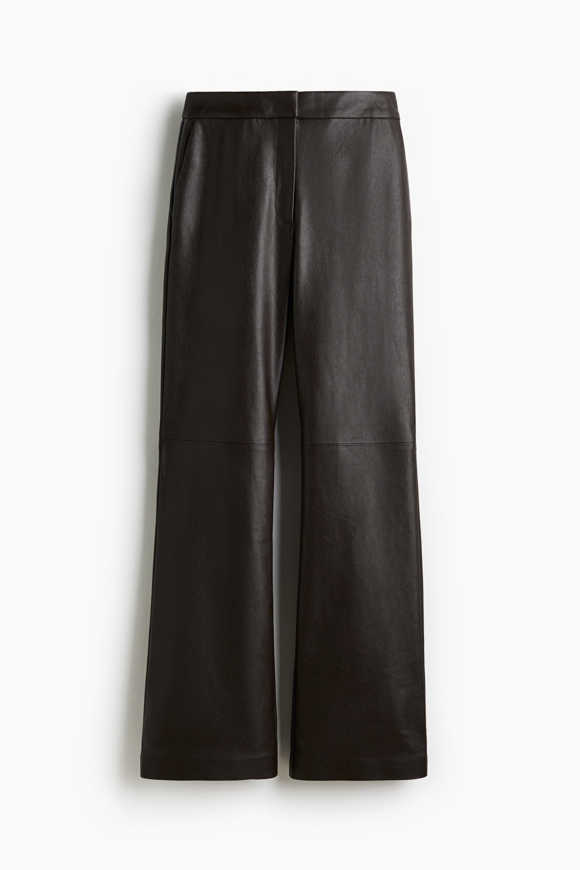Trousers with a zip fly and a concealed button and hook-and-bar fasteners. Diagonal side pockets, fake welt pockets at the back and bootcut legs with a visible seam above the knees.