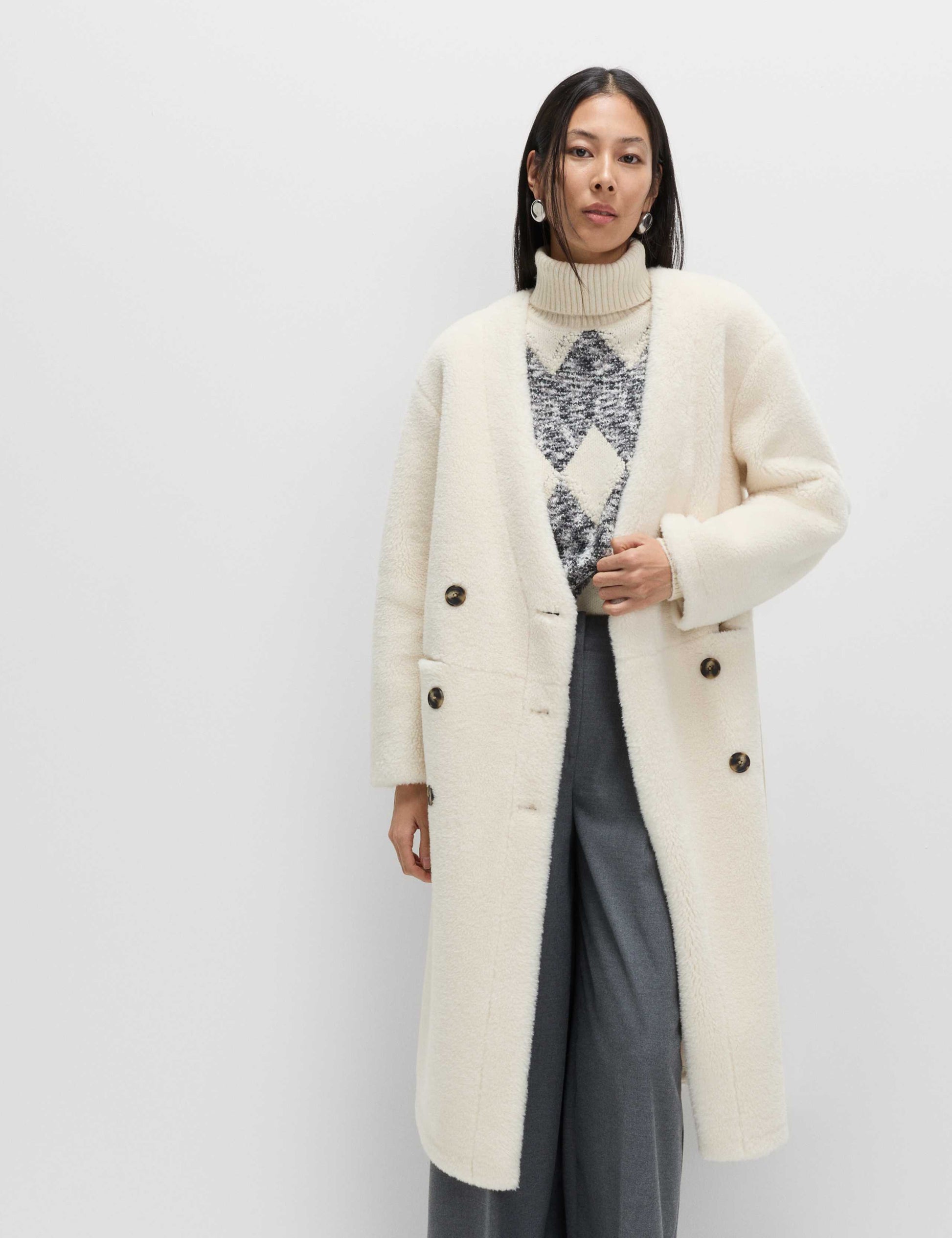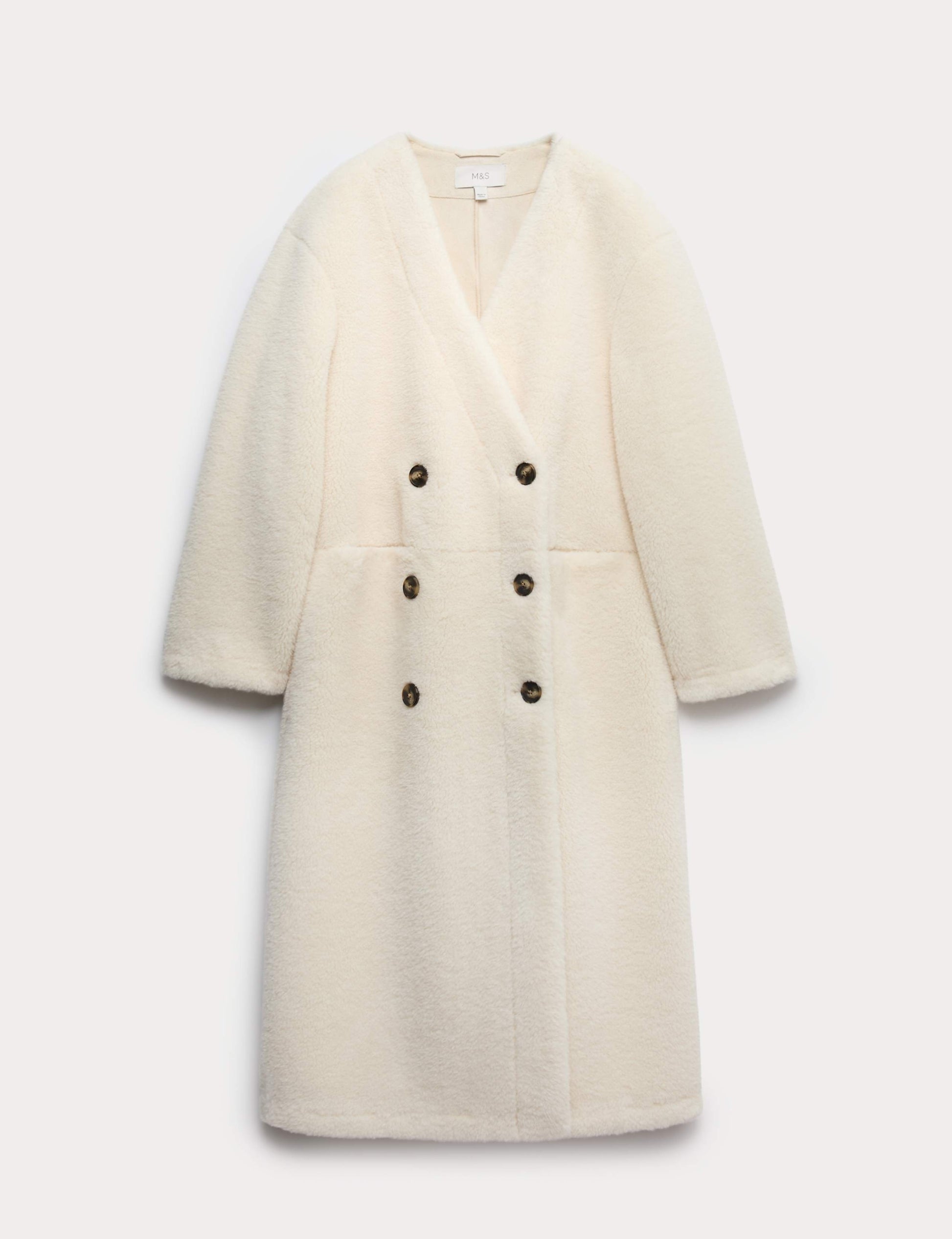 Crafted from sumptuous borg in a classic double-breasted silhouette, this coat is undeniably chic. It's cut in a relaxed fit with a longline shape for extra coverage and a modern feel. A collarless V-neckline adds to the sleek look. Contrast buttons fastens at the front.