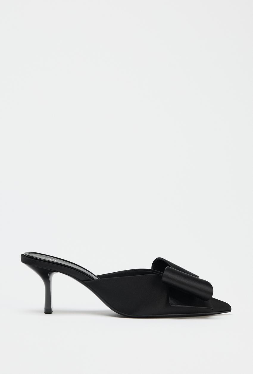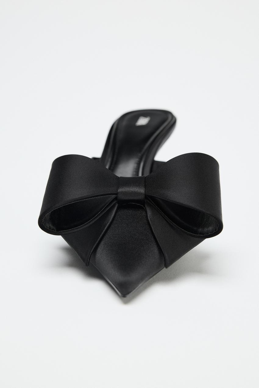 Mule-style heeled shoes. Maxi bow on the front. High stiletto heel. Pointed toe.
